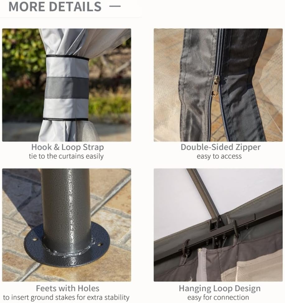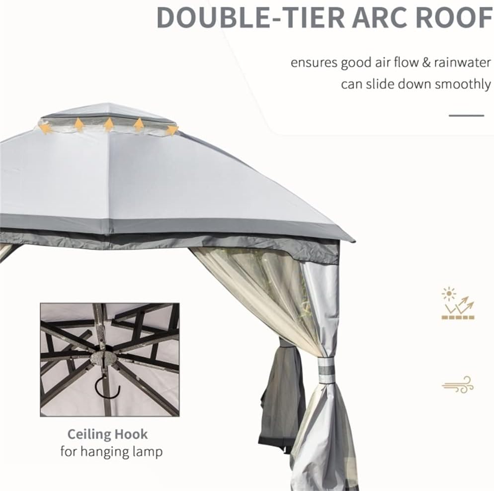 Features:- 12 ft x 9.8 ft gazebo, for patio, backyard, garden, park, etc- Constructed from a solid steel frame, canopy with PU coating- The two-tier roof of the pergola allows air to flow inside, so you have a cool and dry spot to relax in the hot sun.- Mesh netting sidewalls and side curtains for effective protection- Hook on the top for using to hang a lamp- Equipped with 8 ground stakes for extra stability- Assembly requiredSpecification:- Color: Light Grey, Black, Dark Grey- Material: Steel, Polyester- Overall Dimension: 12' L x 9.8' W x 9.7' H- Eave Height: 6.6'- Top Height: 9.7'- Height: 6.4' (from crossbeam to the ground)- Small Roof Size: 34.75"L x 42.5"W- Distance between Columns: 11.2'L x 9.2'WPieces Included:- 1 x Gazebo- 8 x Ground Stakes- 1 x Manual(Other demo items not included).Note:Due to different monitors and lighting effects, the actual colour of the product may differ slightly from the colour shown in the pictures. Thank you!Please allow 1-2 cm deviation due to manual measurement.The side wall of the net blocks unwanted guests with wings, and the side curtains can prevent wet environment.