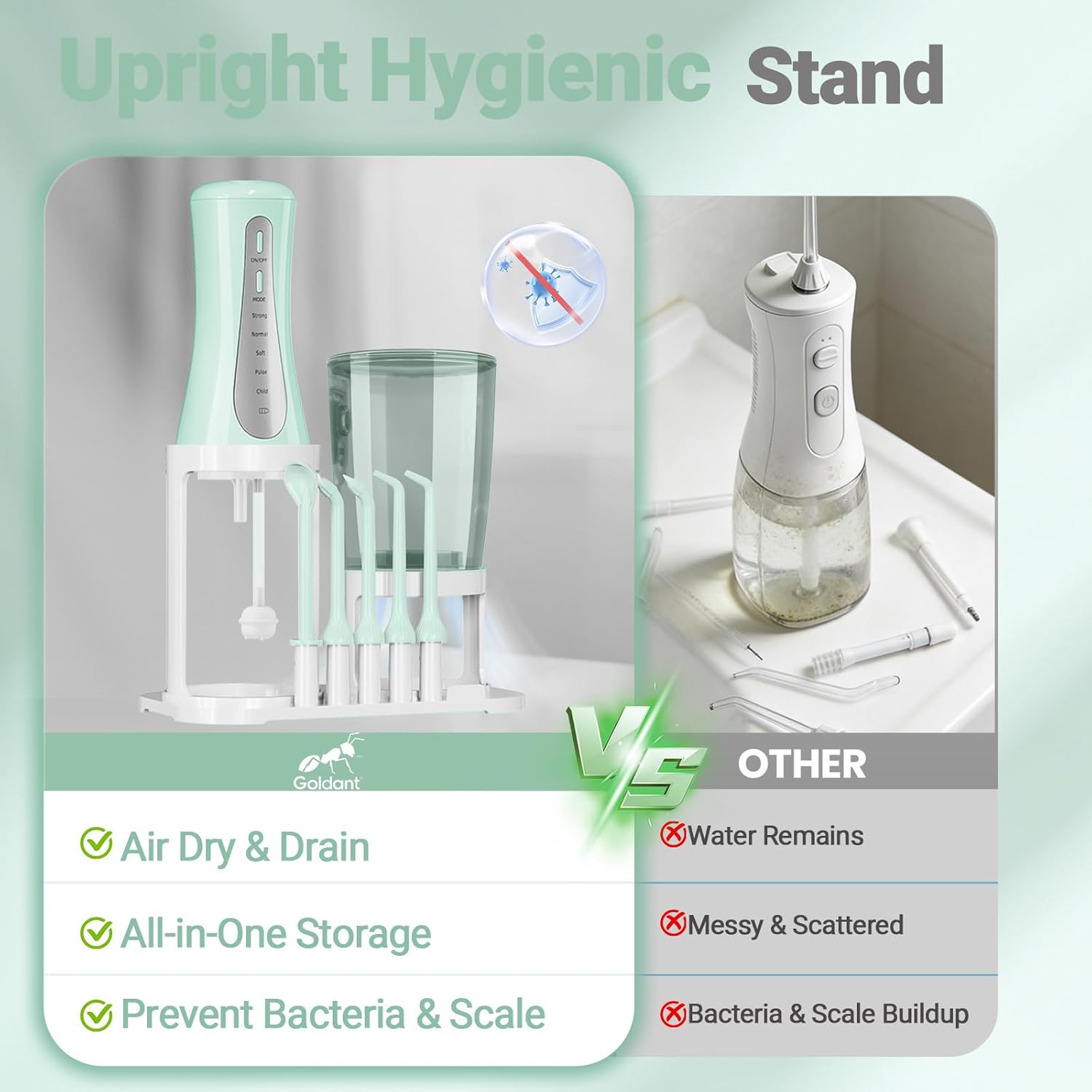 | Additional Features | Detachable Water Tank, Easy Clean Water Tank, Adjustable Modes, Timer, Auto-Adjust to Last Used Mode, 360° rotating nozzles, Gum Care Nozzle, Orthodontic Nozzle, 5 Nozzle Kits, Nozzle Storage Inside Water Tank, Gum Health, Gentle Braces Cleaning, IPX7 Waterproof, Waterproof for Shower Use Type-C Rechargeable, Ergonomic Non-Slip Grip, Quiet Design, Battery Indicator, Long Battery Life, Portable, Cordless, Lightweight, Teeth Cleaning, Travel, Business Trip Oral Care, Multi-User Households, Family Oral Care, Upright Storage Stand, 350ML Water Tank, Hygienic Storage, Efficient Water Drainage, Quick Air-Dry, Non-Slip Base, Easy Maintenance, Extended Lifespan, Ventilated Design, Wide-Mouth Water Tank |