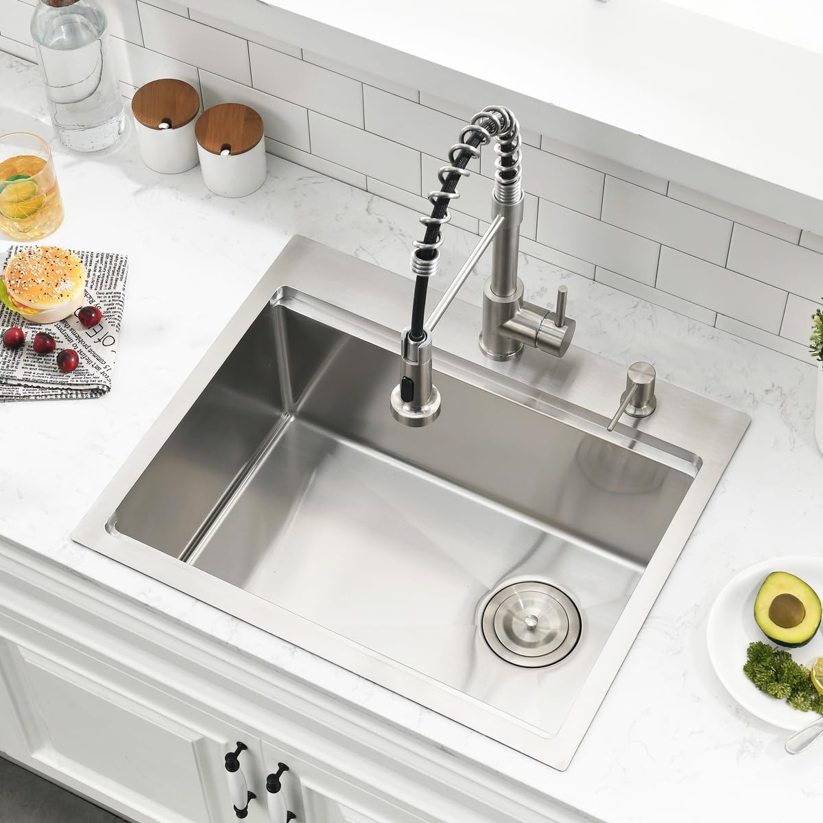 Benefits & Features 1 : Workstation Sink Design :The Drop in Kitchen Sink workstation with single track - ledges on the front and back provide a track for sliding built-in accessories,allows you to work right over the sink while minimizing clutter on the kitchen counter。 include placement of bamboo cutting board, colander and roll-up dish drying rack, saving more workspace. 2:23 inch Drop in Kitchen Sink : The 23 Drop in Kitchen Sink is constructed by 304 stainless steel, added R10 design could let your wiping reach to each corner, easy to clean and long-lasting. 3:Sloped bottom & X-shape Fast Drainage :Rear drainage hole design increases the space for use of the cabinet under the sink. drain hole and X grooves water guide line on bottom, which is faster to remove water. X-shape flow line to avoid clogging. while at the same time retaining elegant look and easy to clean. 4:Noise Cessation & Moisture Barrier :rubber padding on the sink bottom effectively minimize condensation and noise. Use 3mm sound guard undercoating and thick rubber padding,Noise-proof bottom rubber pads effectively cancel noise from daily use,absorb sound from the source, and isolate condensate. 5:23 x 19 Stainless Steel Drop in Kitchen Sink : Exterior Dimensions: 23" Width (Side To Side) x 19" Depth (Front To Back); Interior Dimensions: 21" Width x 15" Depth x 10" Height. Countertop Cutout Size: 21" W x 15" D x R10 mm. Standard 3.5" drain openings will fit any garbage disposal unit. Item : Drop in Kitchen Sink DETAILS DETAILS Product Dimensions:23x 19 x 10inches Item Weight: 26 pounds Color: Stainless Steel Material/Finish Type: T304 Brushed Satin Stainless Steel Installation Method :Drop in Item Package Quantity : 1 Number Of Basins: 1 ACCESSORIES Included Components Sink,Cutting Board,Dish Drying Rack,Stainless Steel Colander, Strainer Drain&Bottom Grid,cut-out template, mounting brackets。