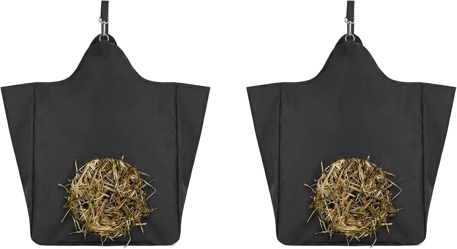 Feature: 【Durable and Strong】Made from heavy-duty 600D Oxford fabric, this hay bag is tear-resistant, water-repellent, and built to withstand daily use by horses and outdoor weather conditions. Reinforced stitching ensures long-lasting durability, making it a reliable choice for stables. 【Hay Hole Design】The feeding hole controls the rate at which your horse eats, preventing overconsumption and reducing hay waste. This mimics natural grazing behavior, supporting better digestion and lowering the risk of colic or other digestive issues caused by fast eating. 【Hanging Design】Designed with hanging hook, the hay bag attaches easily to stall walls, fences, or trailer rings. The reinforced hanging point ensures secure suspension, keeping hay off the ground and clean while allowing your horse to feed comfortably in a natural head-down position. 【Large Capacity】With a large capacity, this hay bag holds enough hay to keep your horse fed for hours, reducing the need for frequent refills. The wide top opening makes loading hay quick and hassle-free, while the rigid shape maintains its structure even when full, preventing hay from getting compressed or stuck. 【Cost-Effective Solution】Ideal for use in stalls, pastures, or during travel, this hay bag keeps hay contained and minimizes mess. The smooth, water-resistant Oxford cloth is simple to clean—just wipe with a damp cloth or hose off dirt and debris, then air dry for repeated use.Specification: Name: Hay Bags Material: 600D Oxford Cloth Color: Black, Blue, Purple, RedPackage Include: 2 * Hay Bag