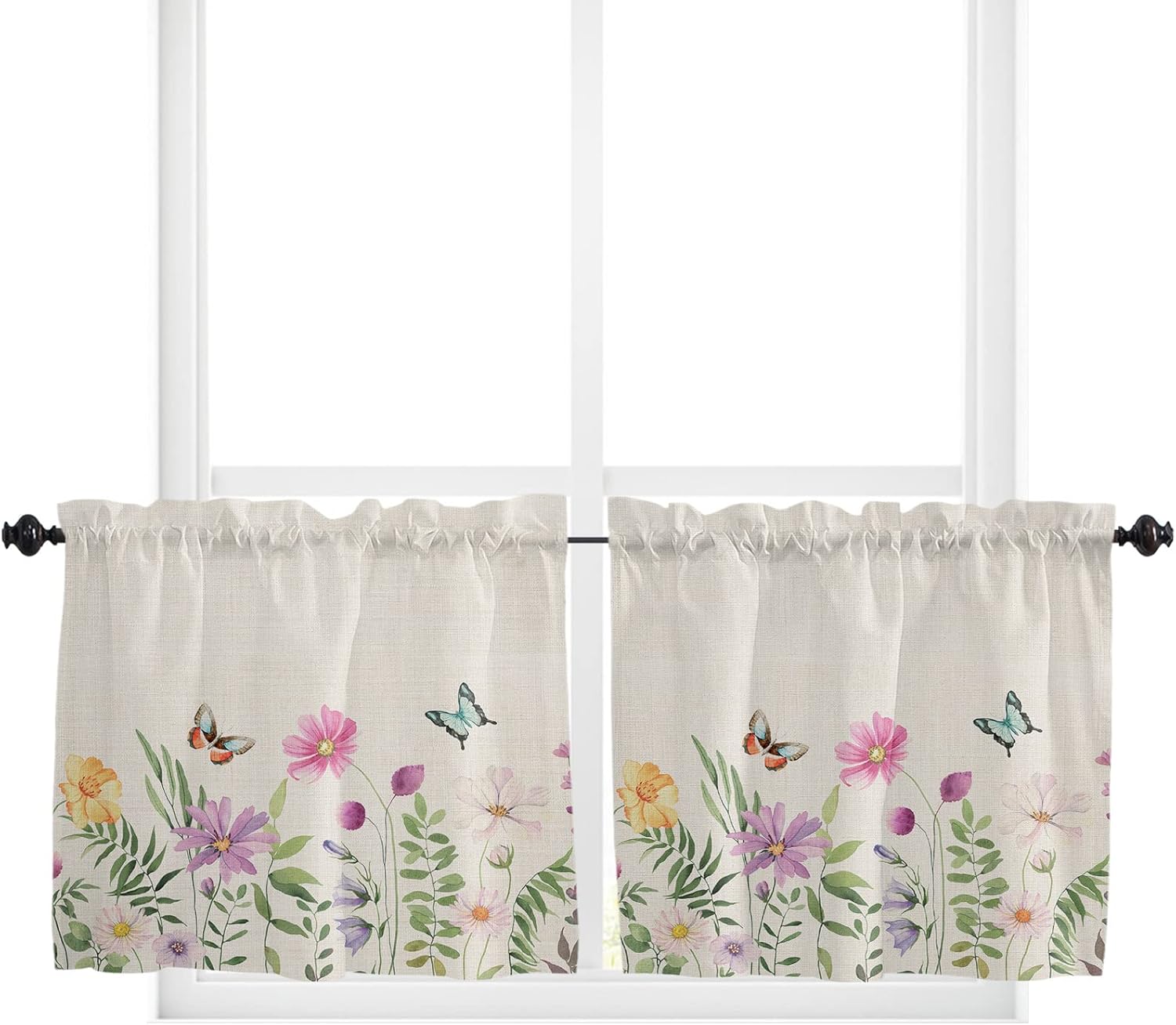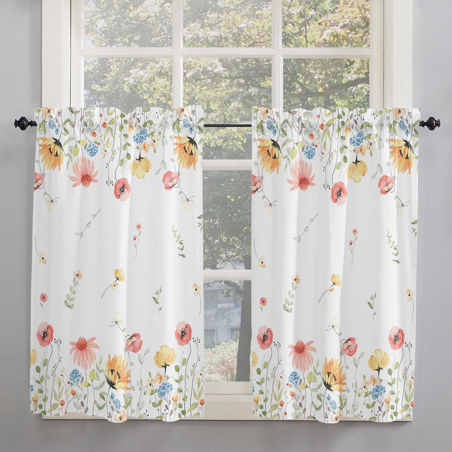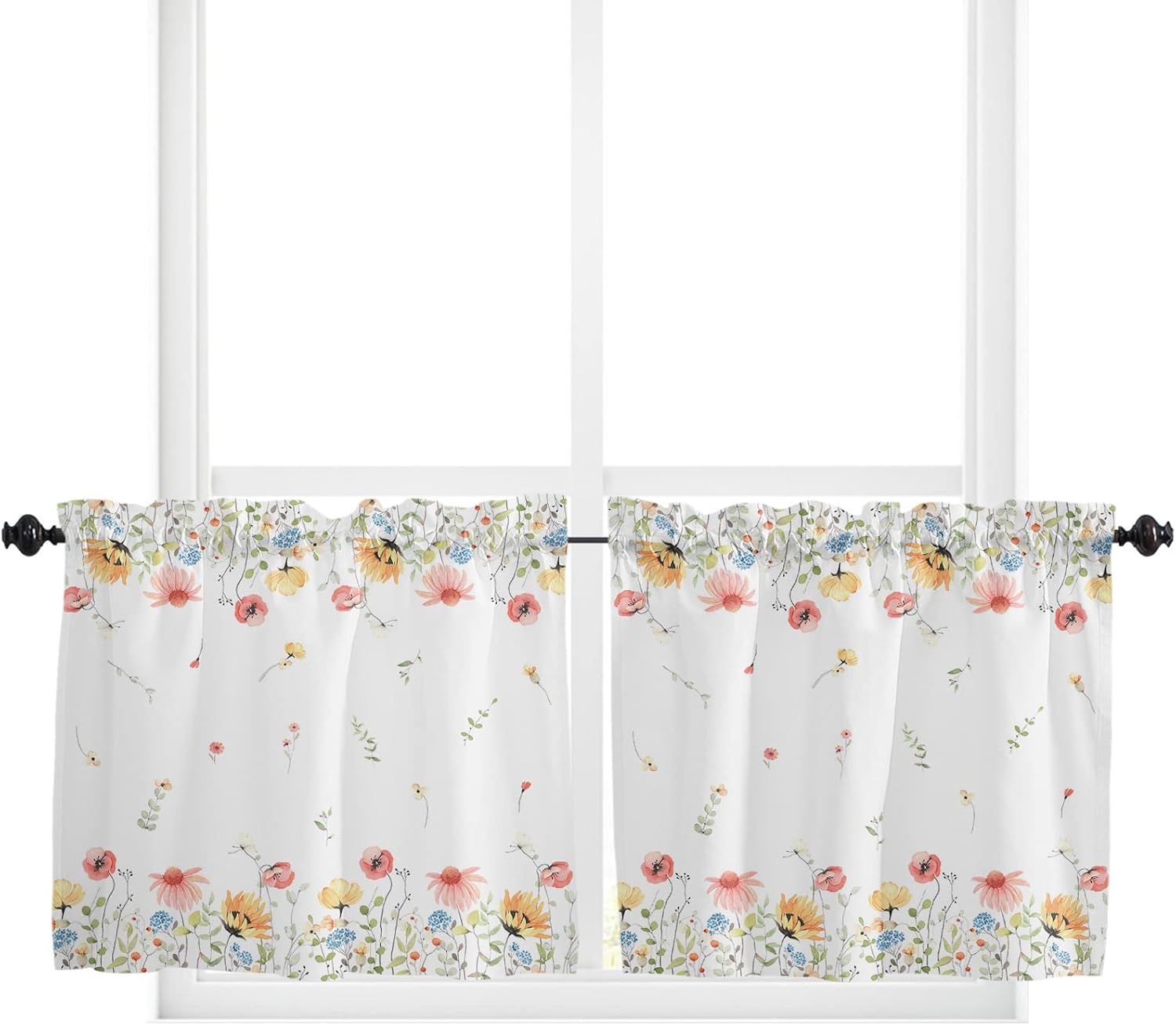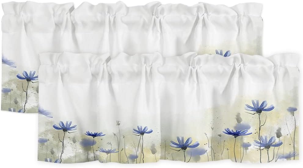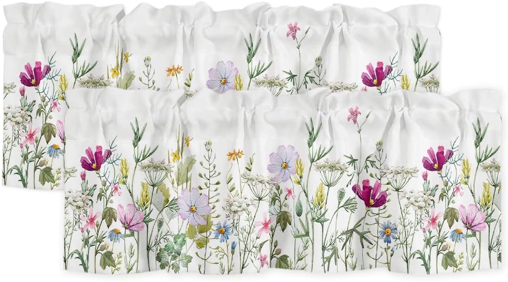 3 PCS CURTAIN SET 2 sizes are available: 🌸Valance Measurements: 54 Inch Wide by 18 Inch Length. 2 Tiers: Each Tier Measures 27.5 Inch Wide by 24 Inch Length. 🌸Valance Measurements: 54 Inch Wide by 18 Inch Length. 2 Tiers: Each Tier Measures 27.5 Inch Wide by 36 Inch Length. GOOD PRIVACY They will provide you the necessary privacy and allow just the right amount of light into your room. ROD POCKET The pocket holes are large enough for most rods in the market, easy installation and move. Premium quality printing ensures vibrant colors and long-lasting durability. GOOD PERFORMANCE Short and small curtains perfect addition to your kitchen, loft, laundry room, guest bathroom, farmhouse, living room, dining room,office, cafe,hotel or other public place, add a refreshing charm to your small window.