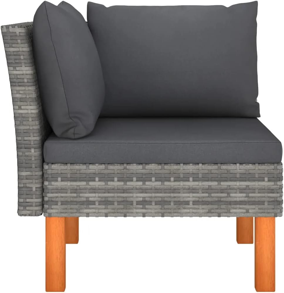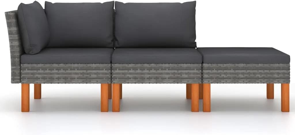This patio lounge set is an excellent choice for relaxing and enjoying the weather, taking a nap, or chatting with your family or friends.Featuring a powder-coated steel frame covered with PE rattan, this patio lounge set is sturdy and easy to clean. The solid eucalyptus wood legs contribute to their sturdiness and stableness. Additionally, the cushions add extra comfort to your lounging time. Equipped with zips, the cushion covers are removable and washable. Thanks to lightweight PE rattan construction, you can move it easily.Important note: We recommend covering the outdoor lounge seating during rain, snow, and frost for its best service to last.Color: GrayColor of cushion: AnthraciteMaterial: PE rattan, powder-coated steel, solid eucalyptus wood with an oil finishMaterial of cushion: 100% PolyesterOverall dimensions of middle sofa: 23.8″ x 25.4″ x 26.4″ (W x D x H)Overall dimensions of corner sofa: 25.4″ x 25.4″ x 26.4″ (W x D x H)Overall dimensions of footstool: 23.6″ x 23.6″ x 12.6″ (W x D x H)Seat width: 21.9″Seat depth: 21.9″Seat height from the ground: 12.6″Seat cushion thickness: 2″Assembly required: YesDelivery contains:1 x Corner Sofa1 x Middle Sofa1 x Footstool3 x Seat cushion3 x Back cushion