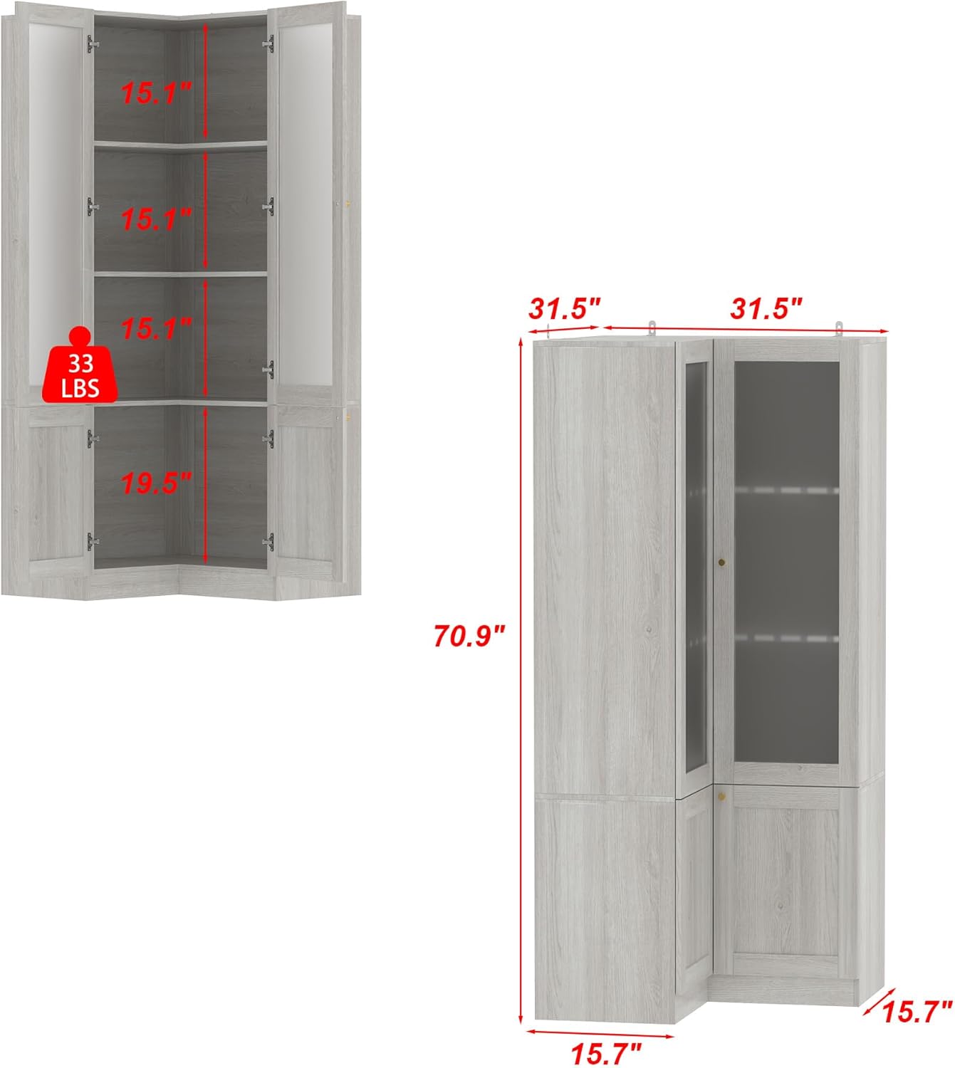 ROMSHINE 31.5"W Corner File Cabinet with Frosted Glass Doors, 3-Tier Bookshelf with 2 Doors Storage, Display Cabinet with L-Shape Shelf for Living Room Home Office, Wood Grain