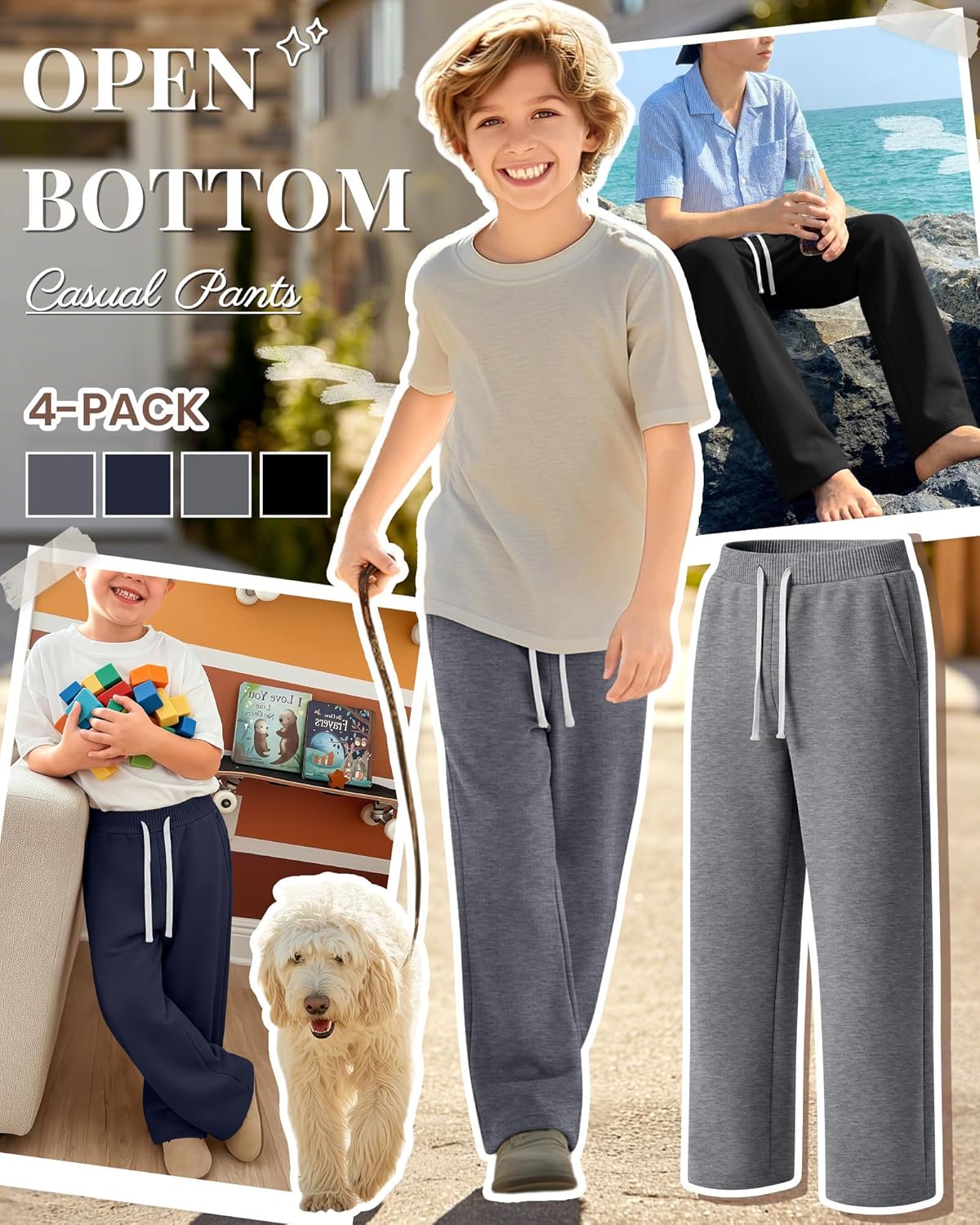 Sweatpants for boys made from a soft blend of 60% cotton, 35% polyester, and 5% spandex. These boys' sweatpants are breathable, stretchy, and comfortable, great for daily wear or active sports. Boys sweatpants size 7-16 years featuring a classic straight-leg cut that reaches the shoes, 2 side pockets, and a drawstring waistband for a snug, adjustable fit. Easy for kids to put on and take off, combining comfort with practicality. Stays in place during all activities. This 4-pack of wide leg sweatpants for boys includes multiple colors, making it easy to mix and match for workouts or casual wear. Machine-washable fabric maintains softness wash after wash. The loose straight-leg design pairs effortlessly with T-shirts, hoodies, knitted sweaters, or casual sneakers, creating versatile looks for various occasions. Ideal for school, jogging, running, workouts, outdoor play, or casual lounging. A stylish and comfortable choice for both active and relaxed days. Material: 80%Polyester, 15%Cotton, 5%Spandex Package Includes: 4 x baggy boys sweatpants Notes: Manual measurement, please allow slight errors in size. Due to different screen displays, the colors may vary slightly. Hand wash in cold water or machine wash on a gentle cycle, hang or line dry, and do not bleach. Please check the size chart before ordering