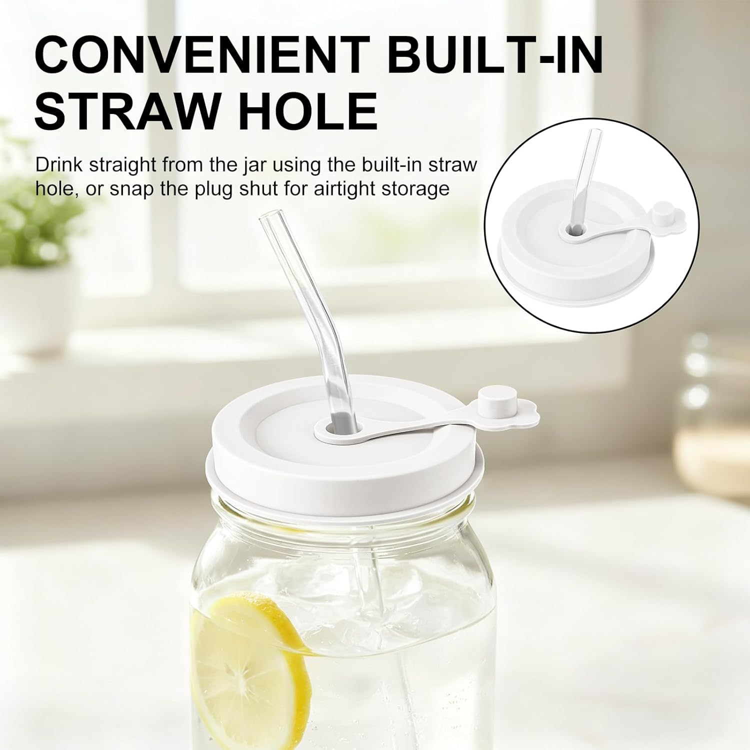 Our two sided silicone lids with straw hole and stopper plug are designed to fit both regular mouth mason jars and wide mouth mason jars, making them a versatile solution for everyday use. The flippable design allows one lid to serve multiple purposes, whether for drinking, food storage, or organizing household items. Made from durable silicone, these mason jar covers are safe, reusable, and built for long lasting performance. Features: 1. Two sided design that works with both regular and wide mouth mason jars. 2. Built in straw hole with a removable stopper plug for spill resistant use. 3. Made from high quality silicone, reusable and durable for daily use. 4. Works as a secure cover for storage, meal prep, or drinking on the go. 5. Dishwasher, freezer, microwave, and oven safe for maximum convenience. Specifications: Material: Silicone Size: Fits regular and wide mouth mason jars Color: White Temperature Range: -40°F to 425°F Package Content: 4 x Two Sided Silicone Mason Jar Lids with Straw Hole & Stopper Plug