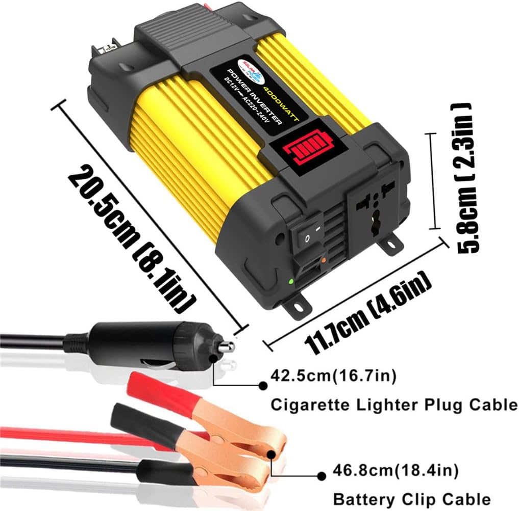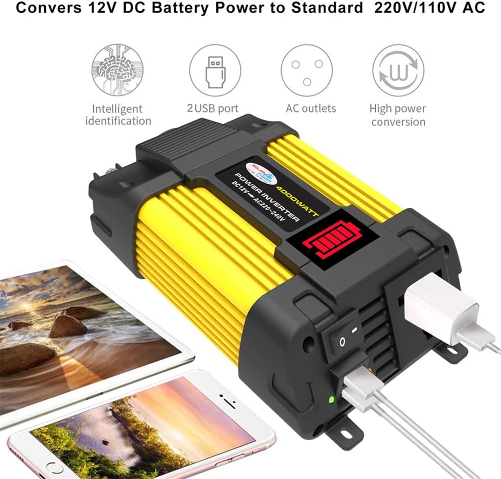 ▶Why Choose FONOBO Inverter?This modified sine wave inverter features an aluminum alloy shell, Equipped with LCD Display & Dual USB, intelligent cooling fan, multiple protection measures. Our power inverter transforms DC power into AC power, widely used for Emergency, Camping, Car, Home, RV, Solar.▶ 8 Safety Protection Function:● Reverse polarity protection● Low input voltage protection● High input voltage protection● Over-current protection● Short circuit protection● Over temperature protection● Overload protection● Internal fuses▶ Product Description● Name: Car power inverter 4000W/6000W● Input Voltage: DC 10.5V~15V● Output Voltage: AC 220V /110V● Output Frequency: 50Hz for 220V / 60Hz for 110V● Peaks Power: 4000W/6000W● Rated Power: 300W/500W● Output Waveform: Modified sine wave▶ Packaging List✔ 1 x Power Inverter✔ 2 x Battery Clip✔ 1 x Cigarette Lighter Plug(gift)✔ 1 x English Manual▶Customer FirstFONOBO Inverter, satisfaction guaranteed with customer service that puts you first. What's the problem Please contact us by Amazon email or official website, our support team 24h is on standby for YOU
