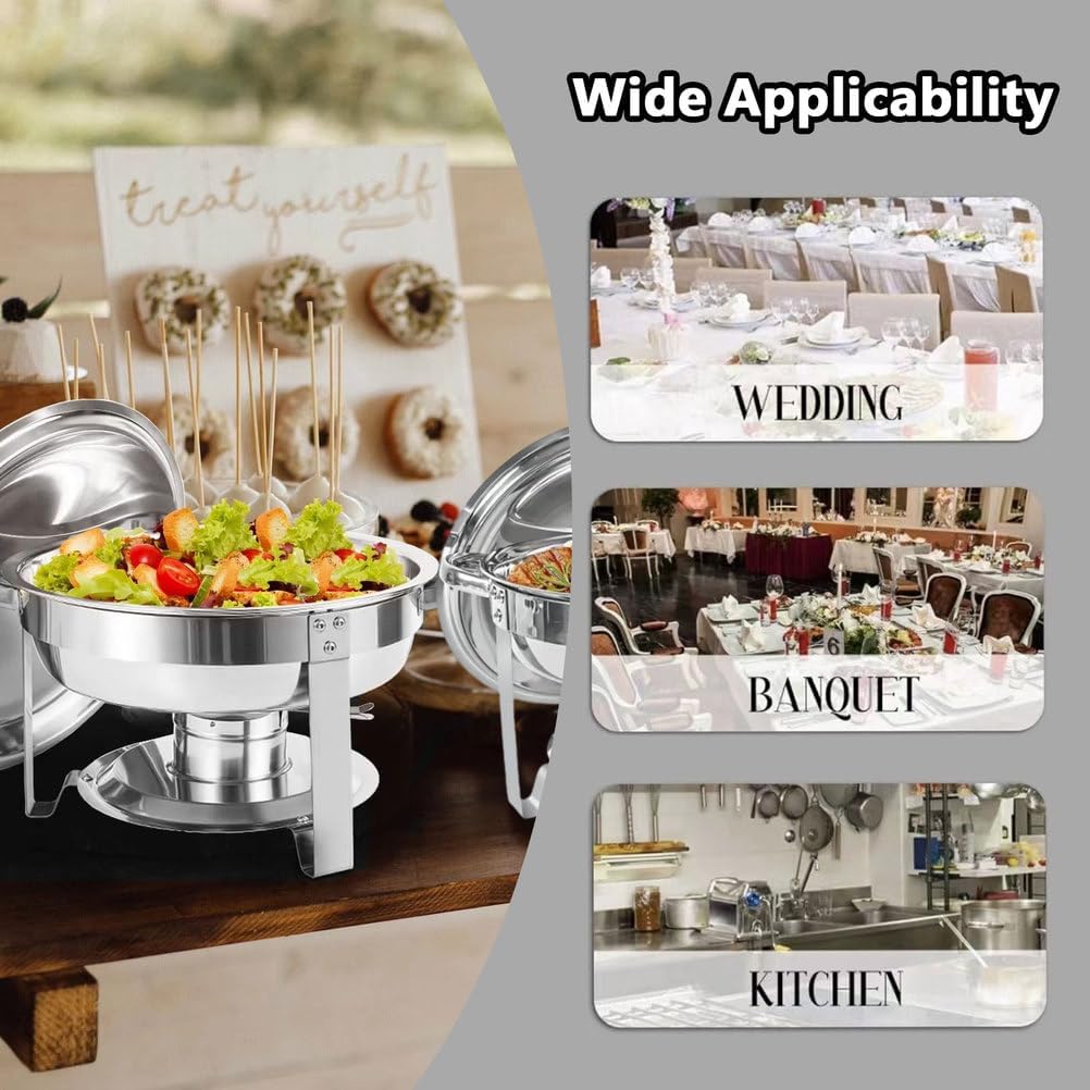 In the cold winter, a hot and delicious meal can warm our body and mind. This chafing dishes for buffet is an indispensable tool in this season. The chafing dish full set can keep the temperature of the food, allowing you to enjoy the food without worrying about it getting cold. Whether you having dinner with family or hosting a party with friends, this round chafer food warmers can bring you a comfortable and convenient diningexperience.This chafing dishes for buffet is suitable for homes, kitchens, restaurants, buffets, hotels, canteens, snack bars, etc. It can keep French fries, rice, chicken, potatoes, pizza, and other dishes at optimal taste.SpecificationMaterial: 304 Stainless SteelShape: RoundNotes1. Please do not touch the surface while the dish is heating to avoid burns.2. Please allow the slight color difference caused by the shooting light and 1-3 cm error due to manual measurement.