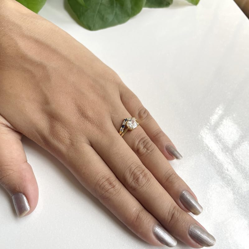 This V Shape Wedding Anniversary Band Crafted in 925 Sterling Silver, available in 14K White, Yellow and Rose Gold Plating. Round Cut simulated Sapphire & Diamond set in prong setting.