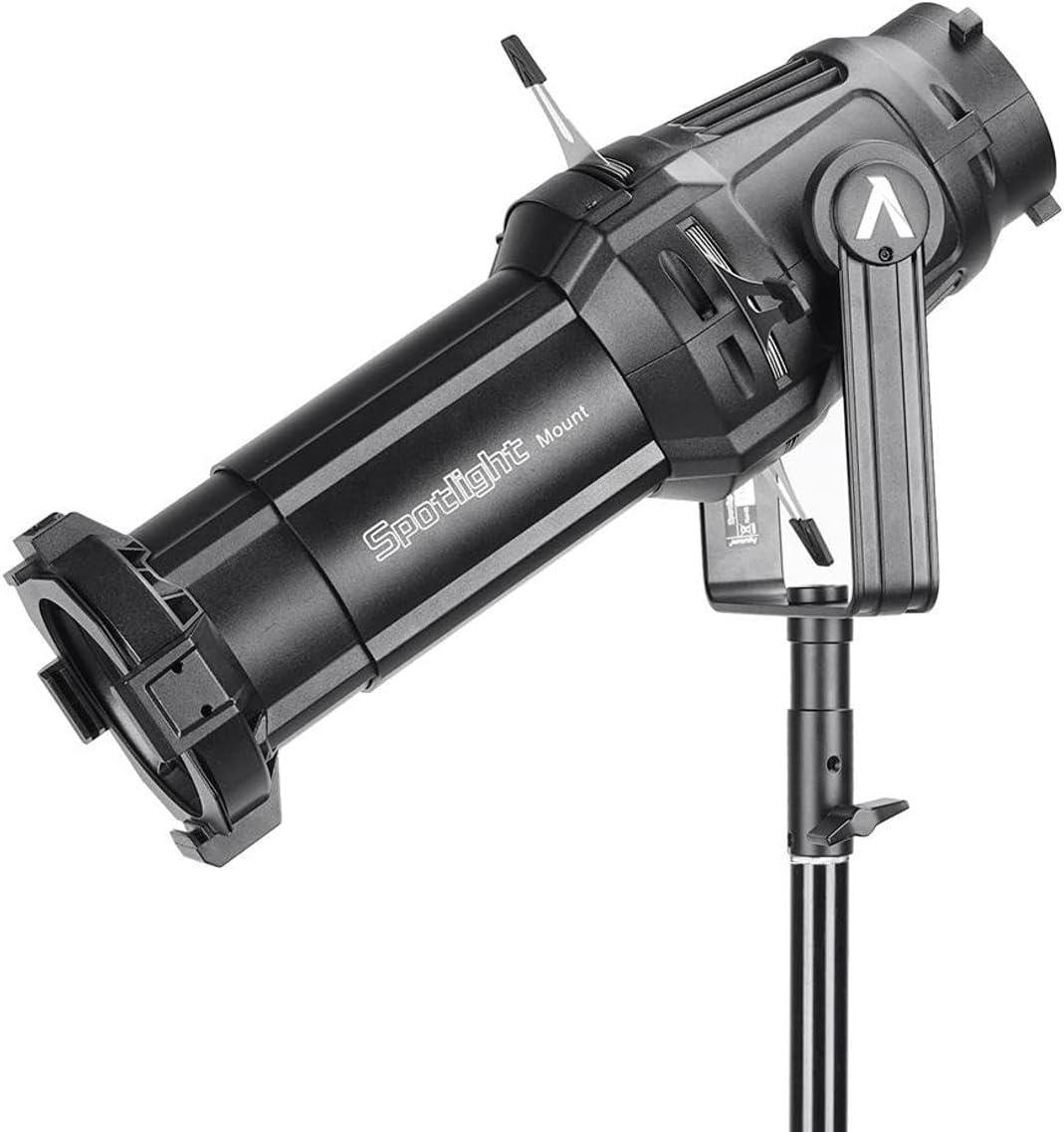 Aputure introduces a whole new class of modifiers with the Aputure spotlight holder kit. Achieve a high level of light control for sharp contours with the integrated bezel, work with the highest precision when equipping your light with one of the three different lenses. Precision optics. The three lenses for the spotlight holder have been specially developed for professionals. The high resolution lenses not only increase the light output of the 120d II by 10 times, they also produce a uniform beam with minimal light drop at the edges and at the same time maintain a constant colour temperature with a deviation of less than 200 degrees Kelvin. Minimal edge stripes. The new lens technology of the spotlight holder minimises chromatic aberrations at the edge of the lighting circuit. Compared to similar ellipsoid lights, the mount reduces the edge colours by only 1 mm at a distance of 5 metres. Light shaping As with typical ellipsoid lights, the spotlight holder also offers an easy change of lenses between 19°, 26° and 36°, regardless of whether you need a larger lighting circuit or a higher accuracy. In combination with the internal aperture, filmmakers can precisely control the shape of the light. Add flair to your set. With the included Gobos (Graphical optical blackout) in B-size, the gobo holder and the gel frame, the spotlight holder allows even stronger light manipulation to easily project any shape or colour. The optional removable aperture allows filmmakers to further optimise the shape and size of the light output. Thanks to the dual slot design of the mount, filmmakers can use Gobo and aperture at the same time. Modular design. In line with the other high quality light modifiers from Aputure, the spotlight holder remains true to the philosophy of versatility and modularity, the Bowens mount can be used for the 120d Mark II and 300d series. Dual junior / baby holder. The spotlight holder has been designed with versatility in mind and features a dual junior and baby mount so it can be attached to any location with a C to combo tripod or lighting grid. Sturdy metal construction. The holder is designed for durability. With its die-cast aluminium housing, it conforms to the Aputure standard for durability while using a lighter design than typical tungsten lamps.
