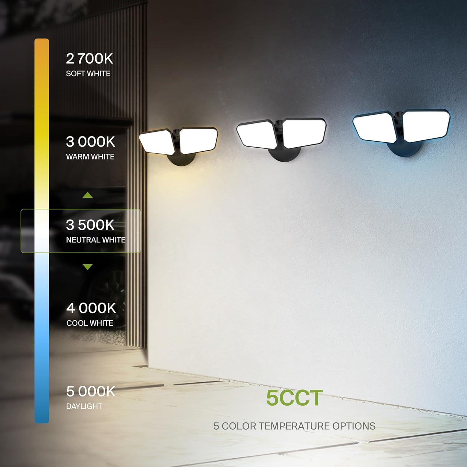 | Other Special Features of the Product | 5 Color Temperature Options, Beam Angle 100°, Installation on a Regular Junction Box, Rotatable Light Heads for Directional Light Control, Wet Locations Rated (IP65) |