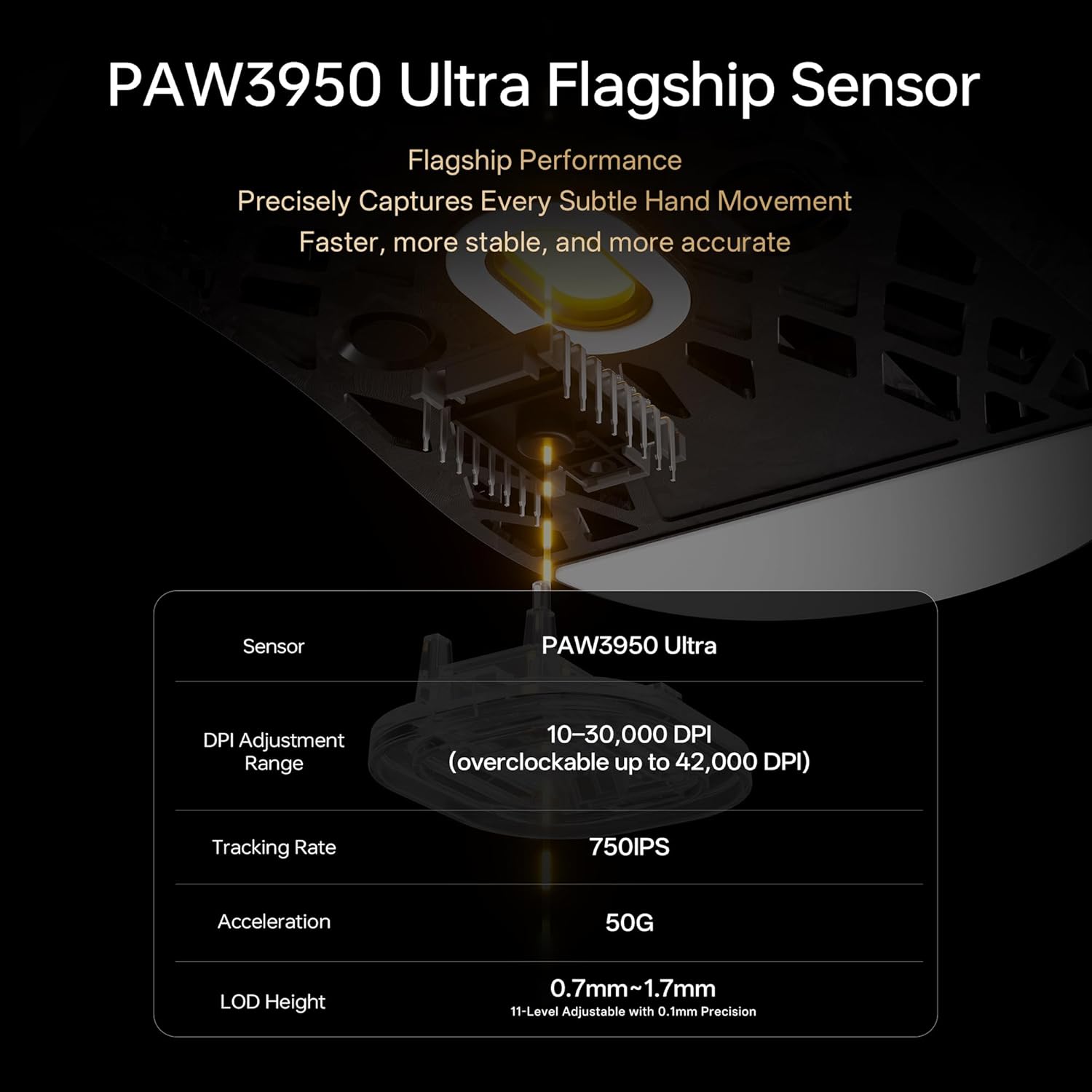 ATK Blazing Sky GHOST is built around a hollow carbon fiber composite construction to deliver a superlight 48±3 g body with a solid, rigid feel. It features the PAW3950 Ultra sensor and an adjustable polling rate from 125 to 8000 Hz for responsive, controllable performance. Finished with an all-new nano coating and sized at 121 × 61.3 × 38 mm, GHOST is designed for fast-paced competitive play with confident handling.