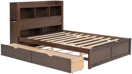 Full Size Platform Bed Frame with Trundle and 2 Drawers, Wooden Storage Full Bed Frame with Pull Out ShelvesThis storage platform bed is simple and fashionable. The headboard features 4-tier pullable shelves for your storage. The drawers and trundle can be swapped position for each other, so that you can position the bed freely according to your bedroom layout. The whole construction is made of solid wood and MDF, so it's designed for long-term use. Weight & Dimensions:Product Dimensions: 88.6''L x 57.6''W x 43.3''H Detail Product Dimensions: Please refer to the Size image Number of Package: 2 Product Weight: 173 LBS Weight Capacity: Bed: 600 LBS Trundle Bed: 250 LBS Recommended Mattress Thickness: 8-10" Trundle Bed: 6" Specifications:Product Type: Platform Bed Size: Full Color: White/Espresso Material: Pine Wood+MDF Box Spring Required: NO Number of Slats: 10pcs/7pcs Assembly Required: Yes Additional Tools Required: All Tools Included Notes:-Manual measurement has been used, there may be some reasonable error. -All the pictures are taken by actual samples, slight chromatic aberration may occur due to lighting or display.