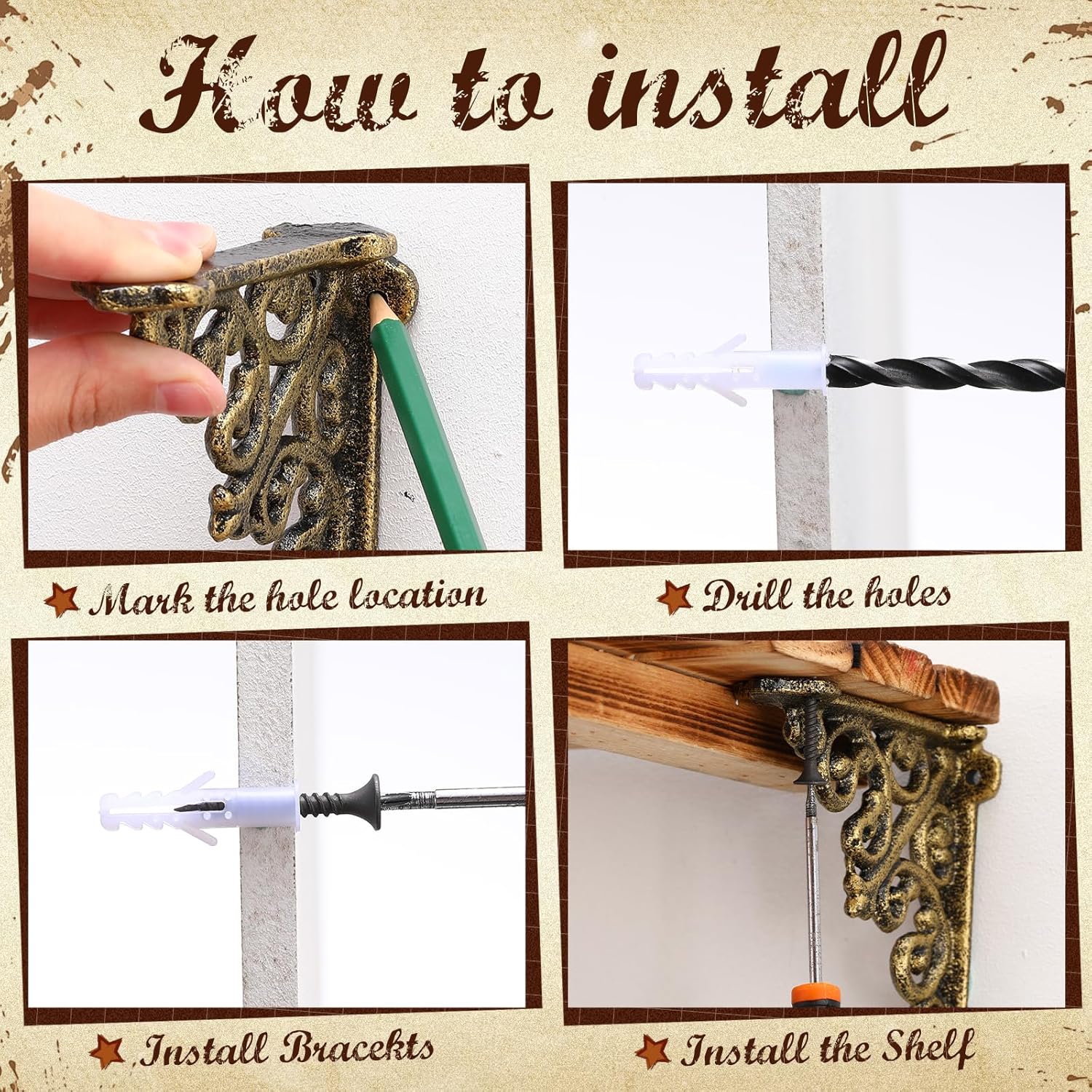 Features: These brackets add a touch of sophistication to any decor. The neutral color seamlessly complements various interior styles, catering to customers who value both functionality and aesthetic appeal in their hardware choices. The package includes 8 brackets with screws included, simplifying the installation process for customers. This complete set ensures everything needed is at your fingertips, providing convenience for DIY enthusiasts and professionals alike. Specifications: Material: cast Iron Color: antique Brass Size: 3.94 x 3.94 inches Package includes: 8 x Brackets(Screws Included) Notes: Manual measurement, please allow slight errors on size. The color may exist a slight difference due to different screen displays
