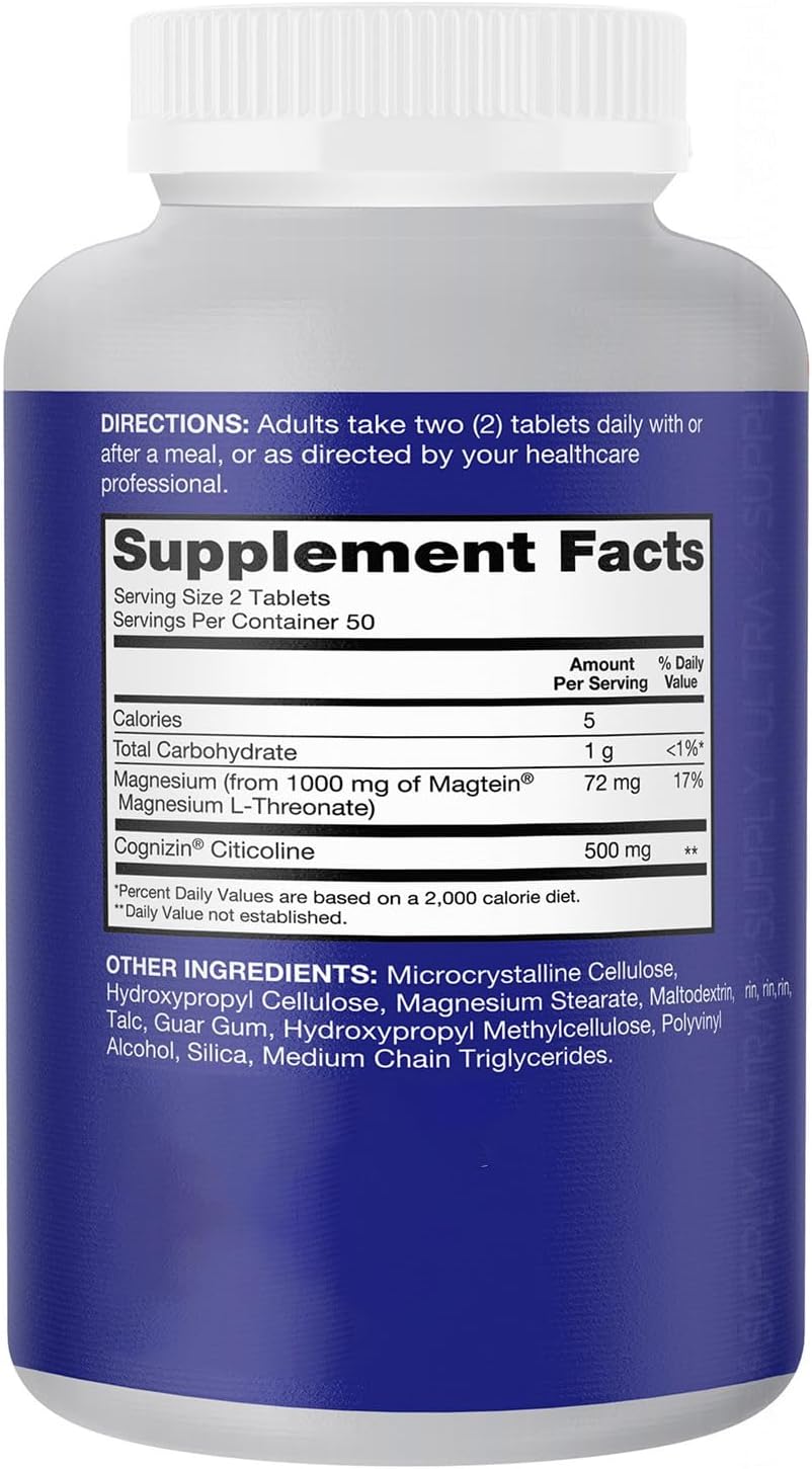 Brain Health Memory Plus - 100 Tablets. Brain Health Memory Plus offers an advanced nootropic formula combining Magnesium L-Threonate and Citicoline to help support daily cognitive performance. This extra strength blend is designed for those seeking sharper memory, sustained focus, and better attention without caffeine or stimulants. Formulated for high absorption, each serving provides 72 mg of magnesium (from Magtein) and 500 mg of Cognizin citicoline, key nutrients that help maintain cognitive balance and clarity. The smooth-coated tablets are easy to swallow and ideal for everyday use. Key Benefits ✔ Promotes focus, memory, and mental alertness ✔ Combines Magnesium L-Threonate and Citicoline ✔ Caffeine- and stimulant-free formula ✔ Easy-to-swallow smooth tablets ✔ 50-day supply - made in a cGMP facility Count: 100 Tablets (50-Day Supply)