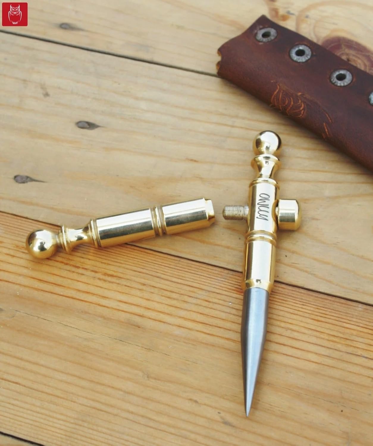 this beautifully crafted Brass and Stainless Steel Marlin Spike Tool, designed for durability, functionality, and classic style. With a polished brass handle and a sharp stainless steel spike, this tool is built to handle knot work, rope splicing, paracord projects, and more. Whether you're an avid camper, a sailing enthusiast, or someone who values quality in their outdoor gear, this marlin spike is an excellent addition to your adventure kit. Crafted from a solid 1/2" brass rod with a highly polished finish, the handle offers an elegant vintage look combined with a sturdy, ergonomic grip. The pointed spike is made from a 10 mm stainless steel rod, designed for precision tasks such as untangling knots, splicing rope, prying, and general outdoor repairs. Its 5-inch compact size ensures portability while delivering reliable performance when it counts. Perfect for marine professionals, bushcrafters, survivalists, outdoor hobbyists, and leatherworking enthusiasts, this tool adapts effortlessly to a wide range of applications. Whether you’re managing paracord in the wild, adjusting rigging on a boat, or working with leather straps at a campsite, the marlin spike gives you the precision and control needed for the job. The included leather sheath ensures safe storage and easy carry, protecting both the spike and your gear. The tool is ideal for daily use in rugged environments and will withstand the elements thanks to its corrosion-resistant materials.
