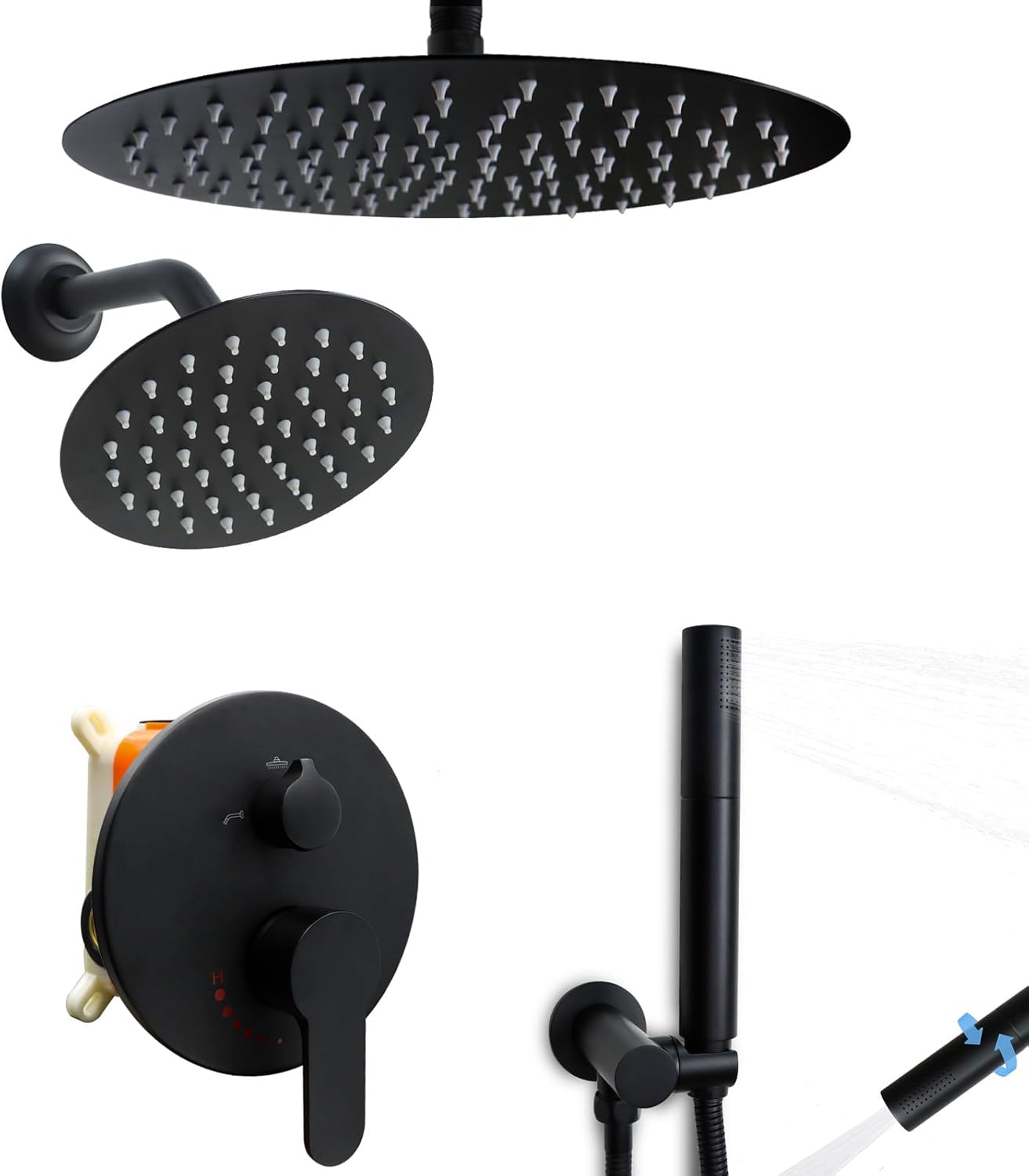 | Included Components | 12 inch Rain Shower Head with Ceiling Mount Shower Arm, 2 Functions Hand Shower with Hose, 3-way Diverter Brass Valve, 6 inch Rain Shower Head with Wall Mount Shower Arm |