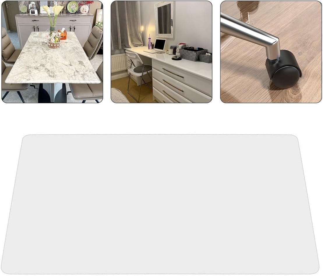 Protects your table from scratches,stains,spills,etc.Clear is the best choice for textured or tablecloth countertops.For glass,marble or other smooth finishes,we recommend frosting to avoid bubblesSpecifications:Name:Clear Desk PadMaterial:PVCShape:RectangularSize:Multiple sizes availableThickness:2mmColor:ClearFeatures:Easy to clean,wipeable,scratch-resistant,waterproof,heat-resistant,non-slipHow to lay Clear Table Protector flat on the table when unfolded?1.Heat with a hair dryer and place something heavy on the curled area.2.Unfold it and place it in the sun.3.Use the steam setting on the iron.4.Lay it out in the reverse rolling direction and use heavy objects to press it down over a few days.