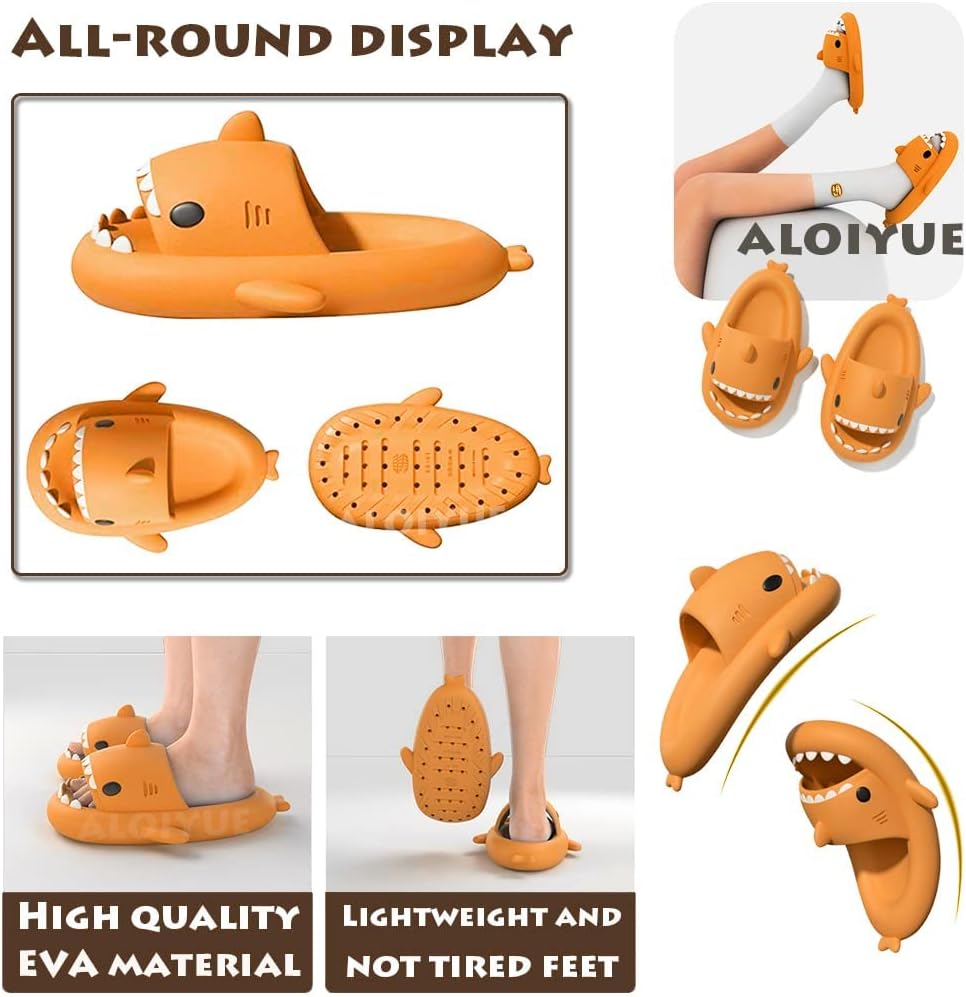 SOFT AND LIGHTWEIGHT: High quality EVA flexible material, super soft, comfortable and durable without odor. These men's and women's summer slippers are easy on and off, breathable, quick-drying and easy to carry EASY TO CLEAN AND QUICK DRY: The adults shark cloud slides are easy to clean with soap and water, suitable for varieties of scenes : beach, pools, amusement park, kindergarten, bathroom GIFTS FOR WOMEN AND MEN: Versatile and fun shark slides for women and men, suitable for year-round indoor and outdoor. Cute and simple design, boys and girls can freely match different styles of clothing.These slippers are suitable for everyone, any gender or age. It is a great companion for bedrooms, bathrooms, gardens, spas, gyms, swimming pools, beaches, dorms, public showers, steam rooms and more. All seasons. 【Soft and Comfortable】: Cute pattern design, unique open toe design, let the shark's mouth open and close when you walk, novel and interesting. Designed with a concave sole that protects your toes from kicking off table legs or door sills. 【Perfect Gift】: Shower slippers are more fashionable and unique than similar slippers. Is for Christmas, New Year, Birthday, Halloween, Thanksgiving, Valentine's Day for Wife, Daughter, Mother, Grandmother, Father, Boyfriend, Husband, Family, Friends An ideal gift for your loved ones.