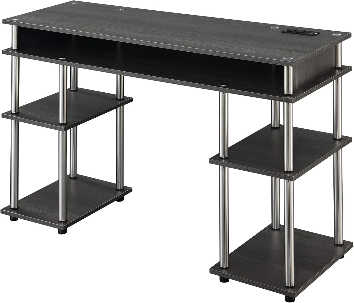 Looking for a place to work or study with a quick and easy set up? The Designs2Go No Tools Student Desk with Charging Station by Convenience Concepts is perfect for you! This stylish desk features plenty of storage space with a unique assembly that requires no tools. The charging station conveniently located on the desktop includes two standard outlets and two USB ports which can charge a phone, tablet, laptop and more! Made to be sturdy with stainless-steel poles and a rich finish, this desk is built to last. Great for an office or dorm, this desk is not only for a student but anyone wanting to add simplicity to their workload.