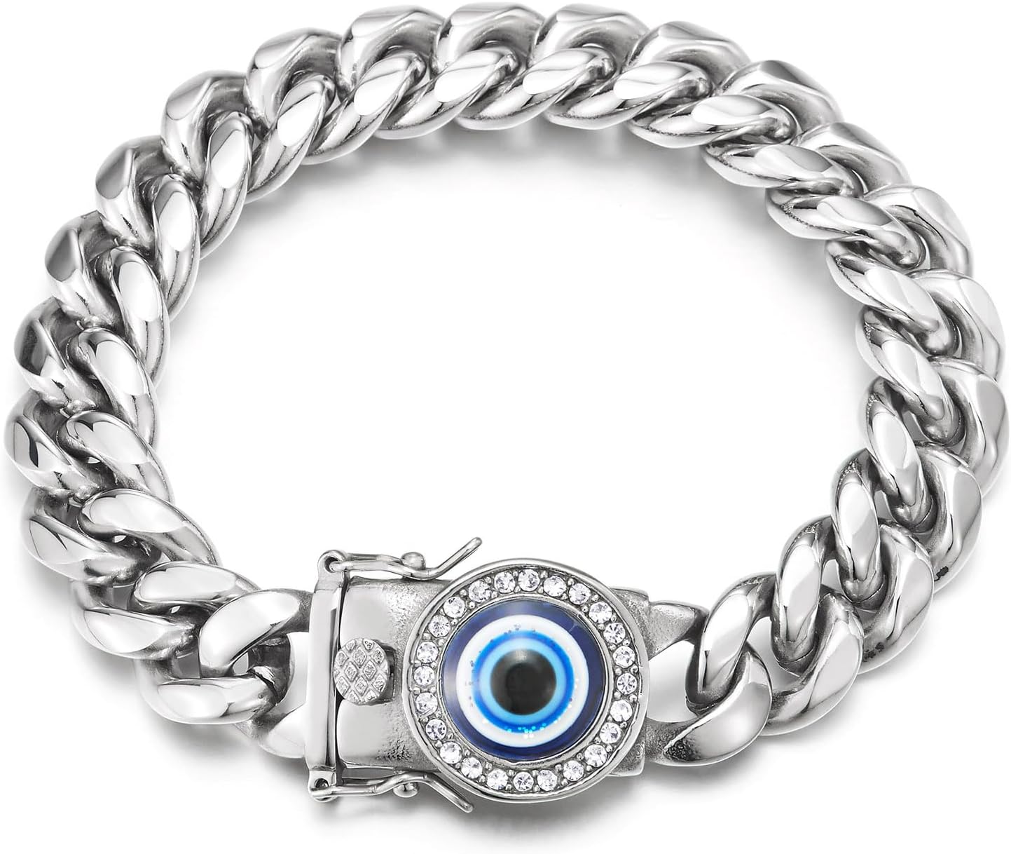 | Style | Gold Color, Steel, Cuban Link, CZ, Blue Evil Eye, Large, Curb Chain, Box Clasp |