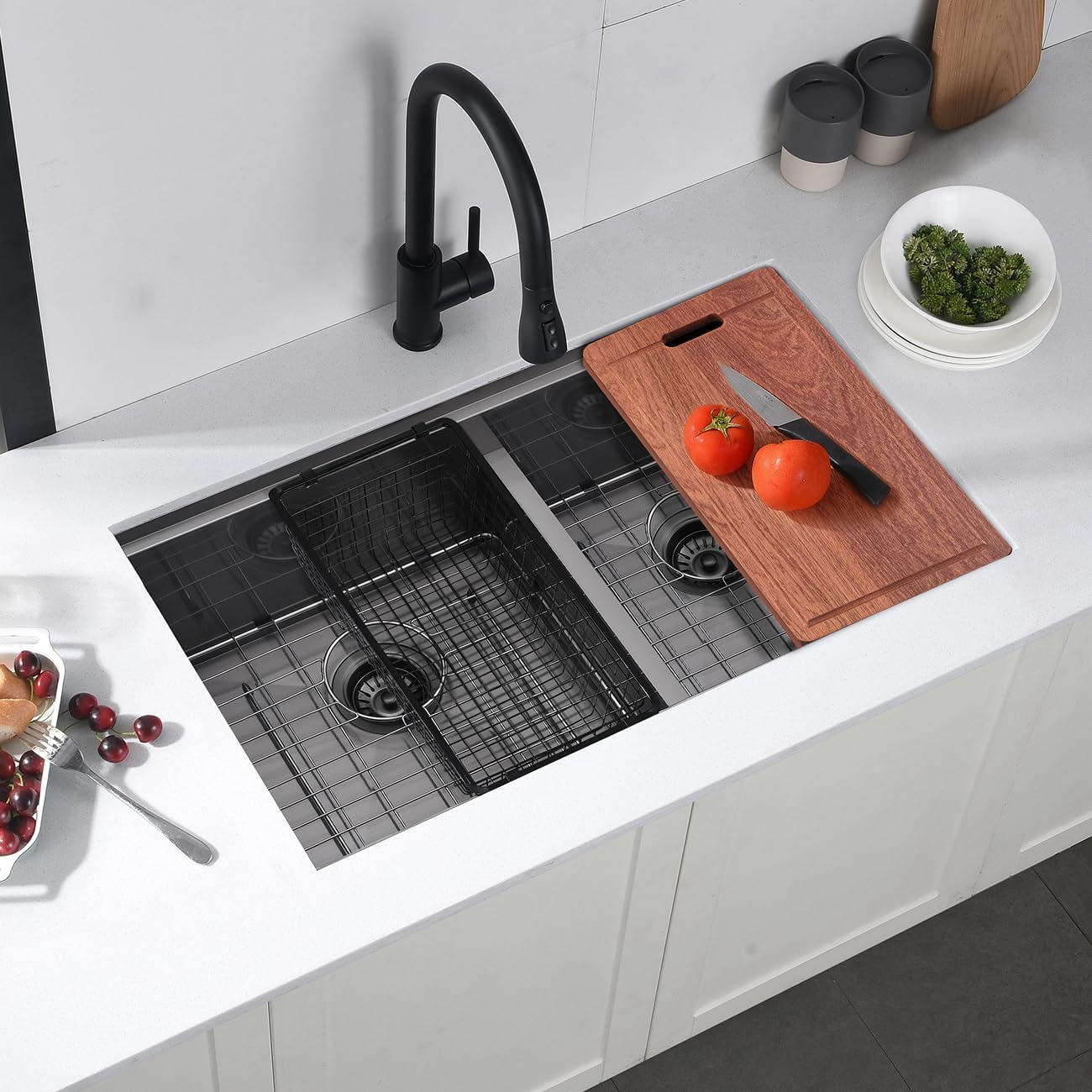 | Included Components | 3.5" Standard Sink Drain x 2, Chrome Finishing Bottom Rinse Grid x 2, Drain Basket, Sapele Cutting Board |