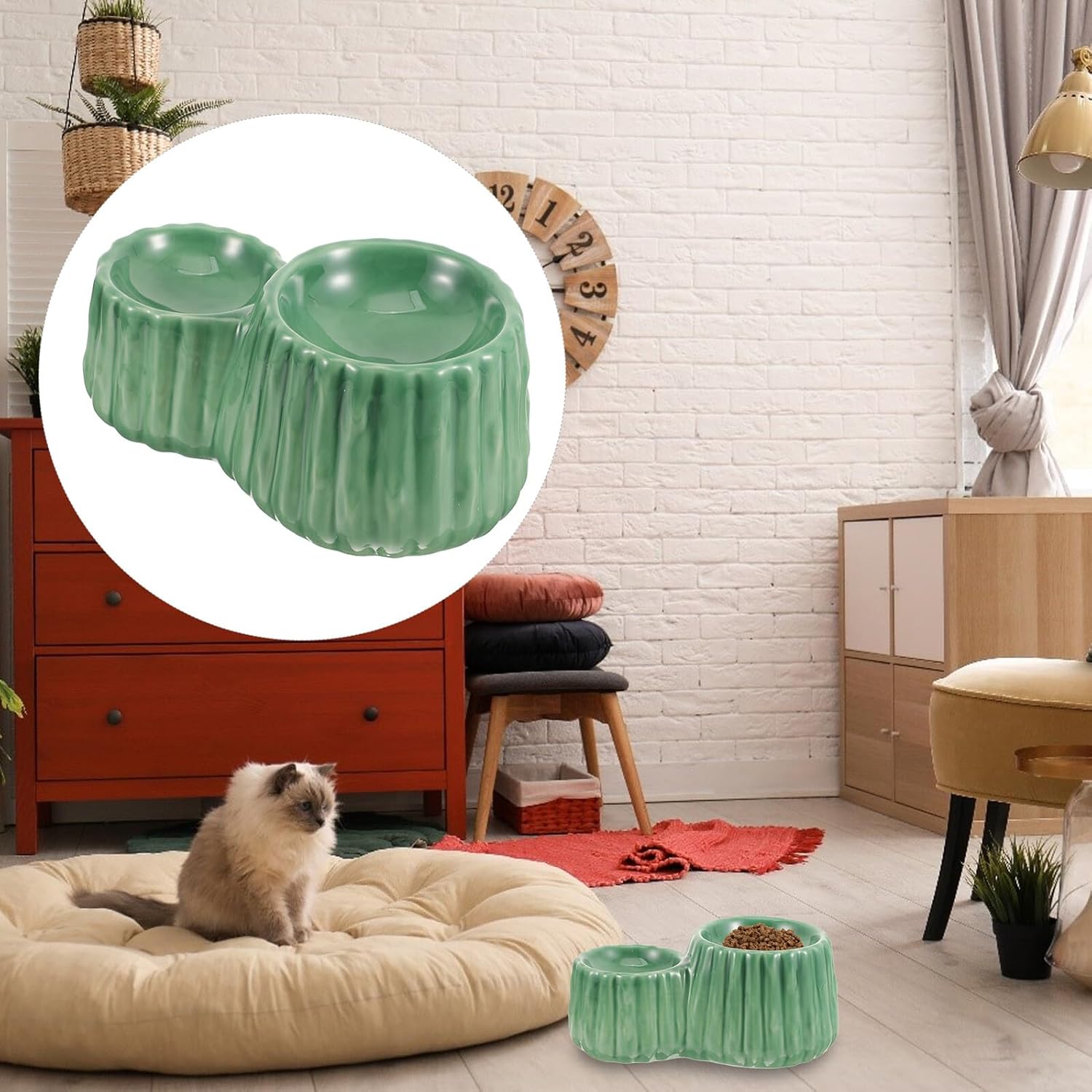 DOITOOL Elevated Ceramic Cat Feeding Bowl Set with Dual Height, Whisker-Friendly Tilted Design, Green Raised Pet Feeder for Cats and Small Dogs
