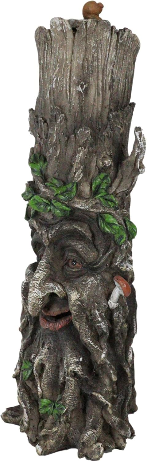 This is a conceptually genius figurine depicting the wisdom of the greenman tree man forest spirit. Light up an incense stick and stick the handle end to the base of the cork lid of the sculpture. See smoke exiting through the nostrils of the tree man. The pillar sculpture takes the form of an aged tree with green leaves foliage and fungal mushrooms.