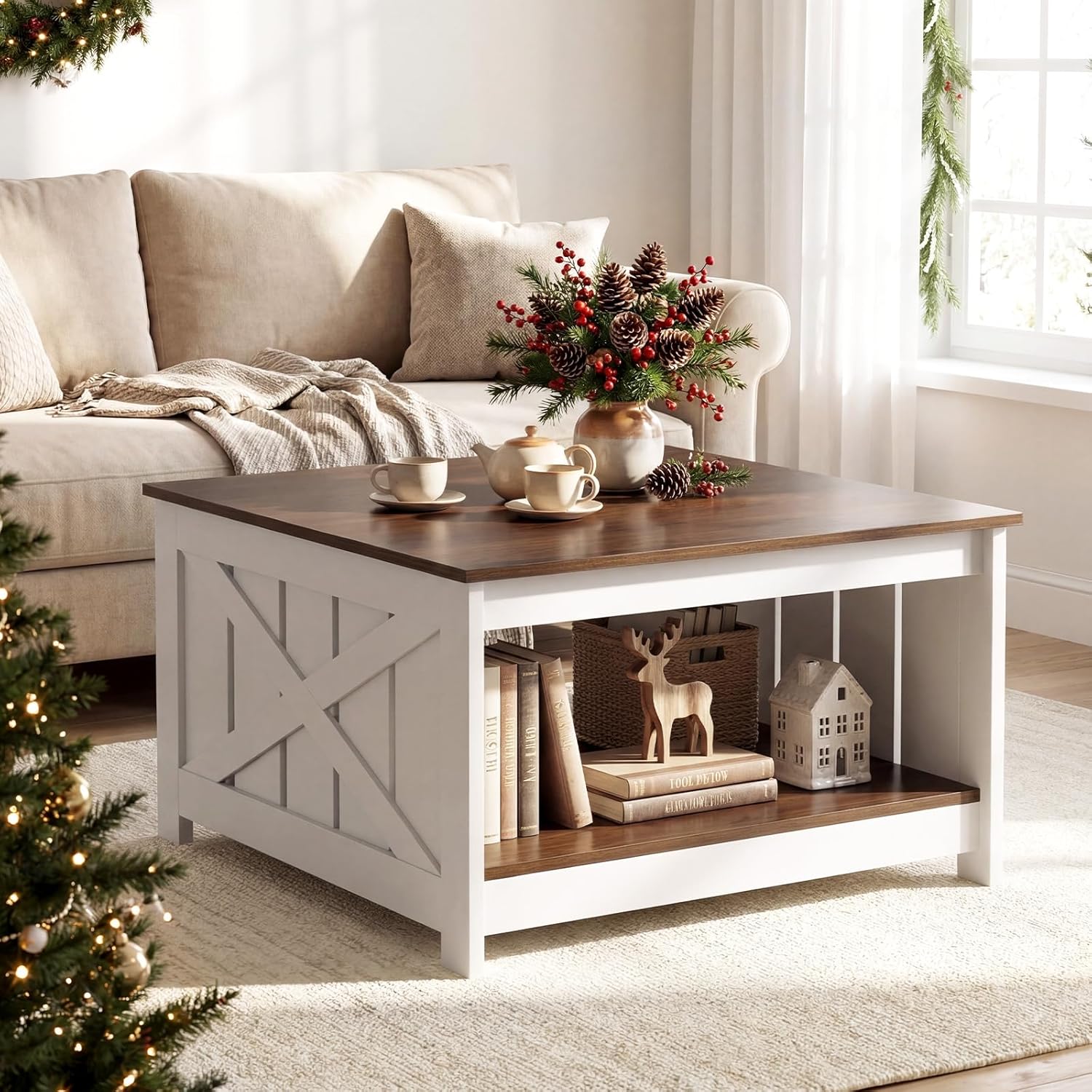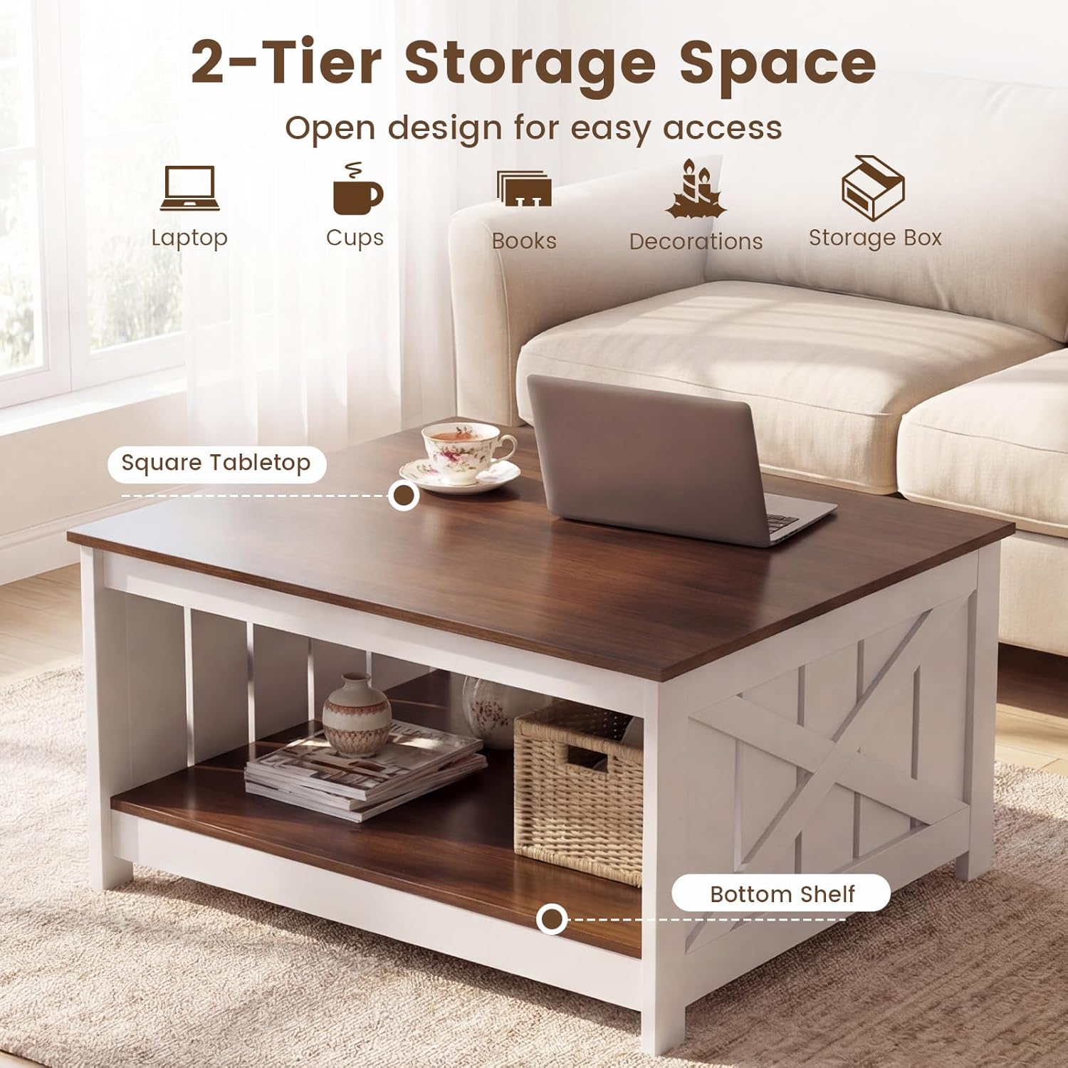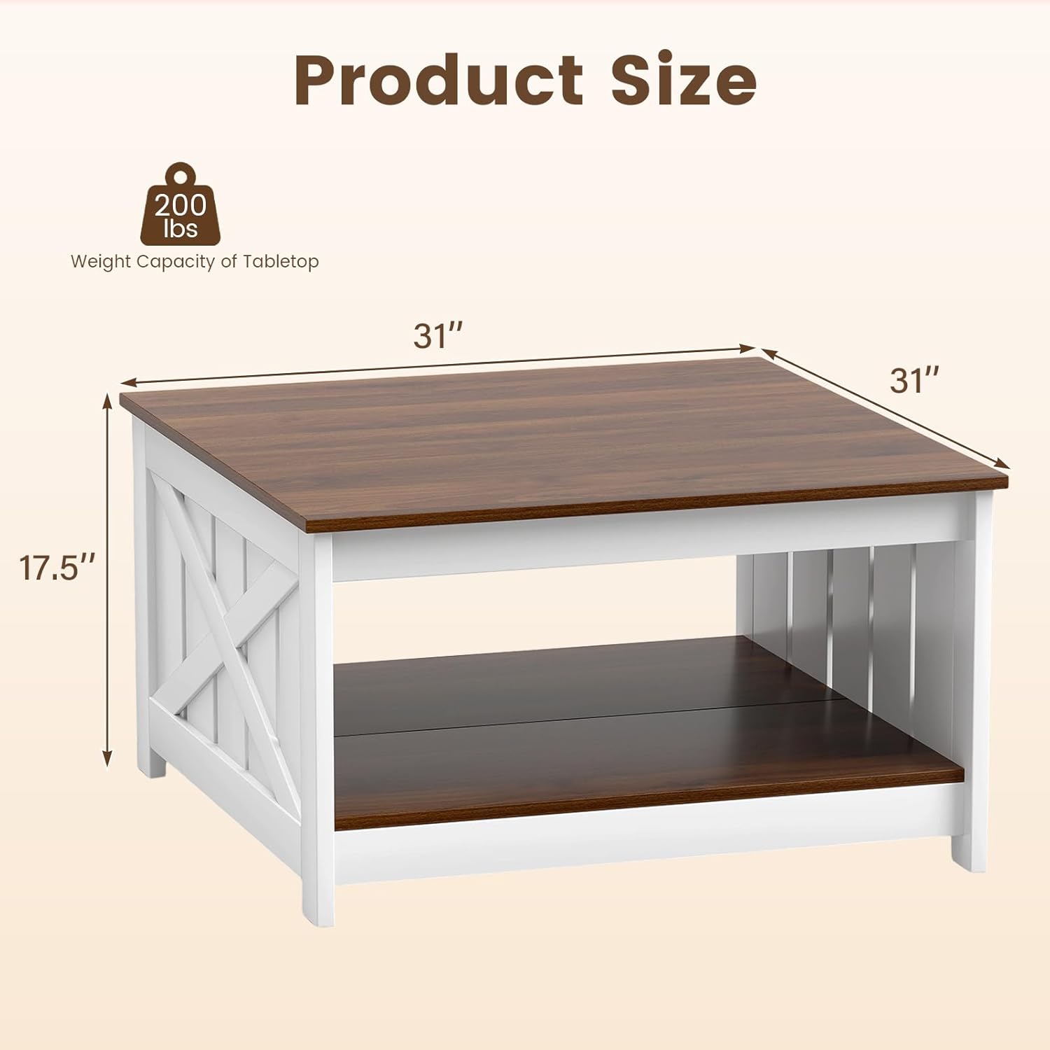 Description:Elevate your living room with this versatile and chic center table.This coffee table artfully combines rustic wood grain with elegant appearance, offering both aesthetic appeal and farmhouse touch. For storage convenience, the square tabletop and bottom shelf provide easy access to books, magazines, or decorative items, keeping your living space organized and tidy. Constructed with stable support legs, this wooden rustic cocktail table remains firmly in place. Its ease of maintenance and ample storage options make it a practical choice for any space.Features:2-tier storage space with open design for easy access Ample storage space for books, plants, decorations and storage boxThickened tabletop is enduring, wear-resistant and easy to clean Sturdy support legs ensure stable and reliable constructionFarmhouse style adds a touch of charm to your homeVersatile coffee table for working, dining and entertainmentAssembly neededSpecifications:Color: White & Brown/NaturalMaterial: Engineered Wood, MDFProduct Size: 31" x 31" x 17.5" (L x W x H)Weight Capacity of Tabletop: 200 lbsWeight Capacity of Shelf: 110 lbsNet Weight: 38.5 lbsPackage Includes:1 x Square Coffee Table1 x Instruction