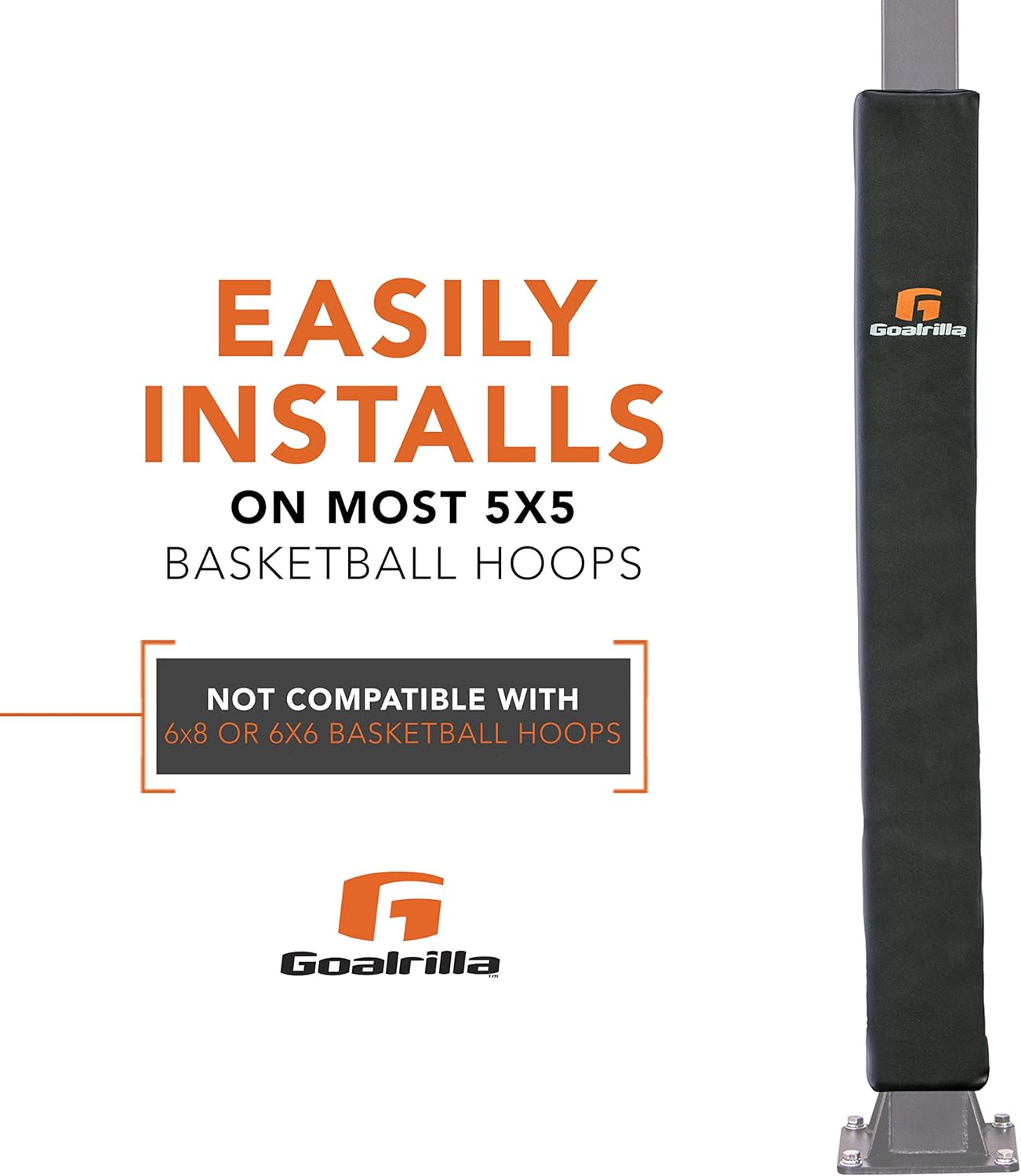 Sixty-eight-inches high, with 1.5 inches of foam between you and the pole, this Goalrilla square basketball pole pad will protect during even the most aggressive play. Its built-to-last, rugged construction includes a reinforced base, durable straps, and weatherproof material for all-season wear. It fits all Goalrilla 5x5 inch poles. The pole pad is not compatible with 6x6 and 6x8 inch poles. The square pole pad takes no time to install. This product is backed by a 90-day limited warranty.