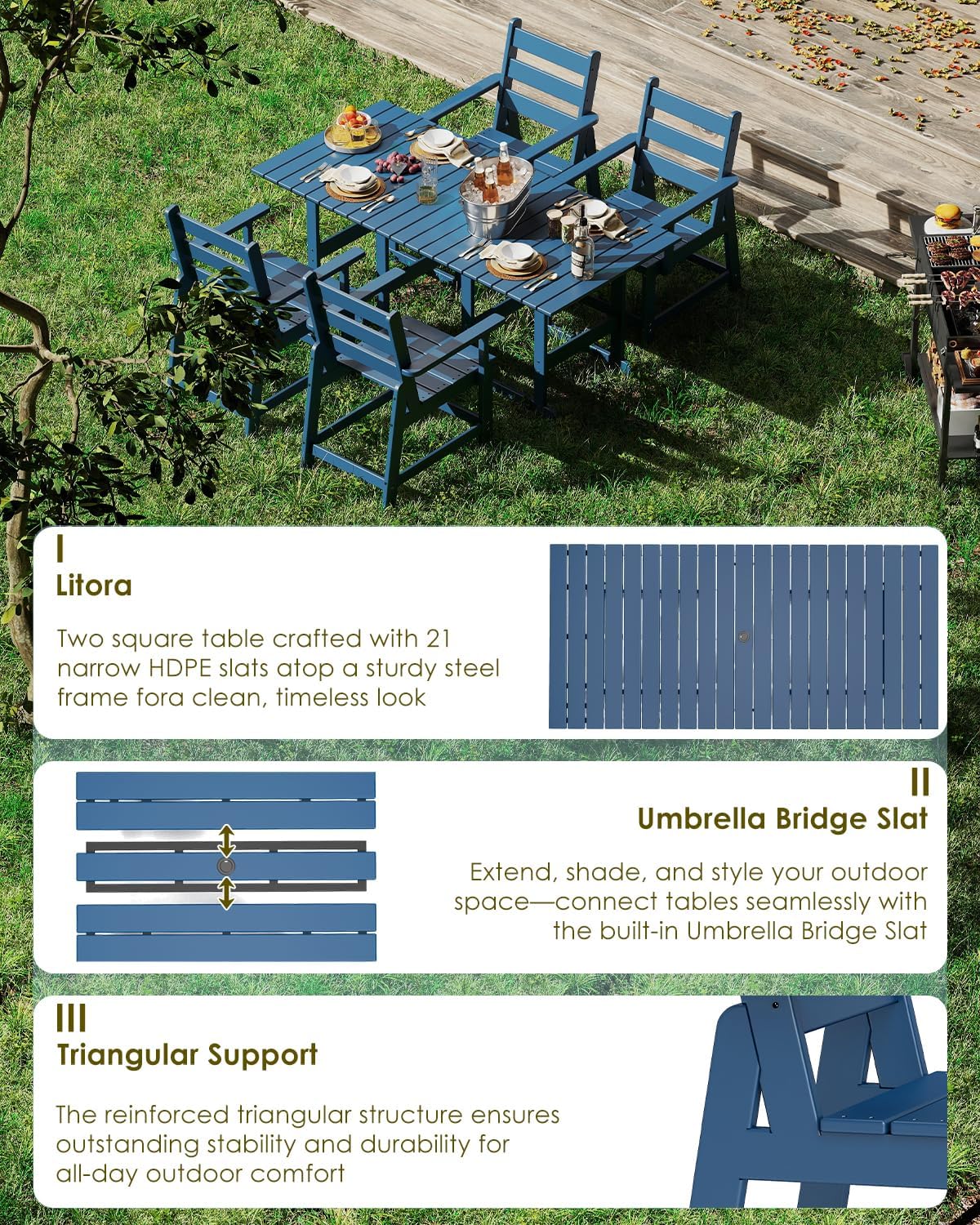 GREENVINES 5-Piece-Outdoor-Table-and-Chairs | HDPE | Patio Furniture | Slatted Dining Sets for 4 | Removable Armrests | Connectable Tables | All Weather | for Backyard Poolside Garden | Blue