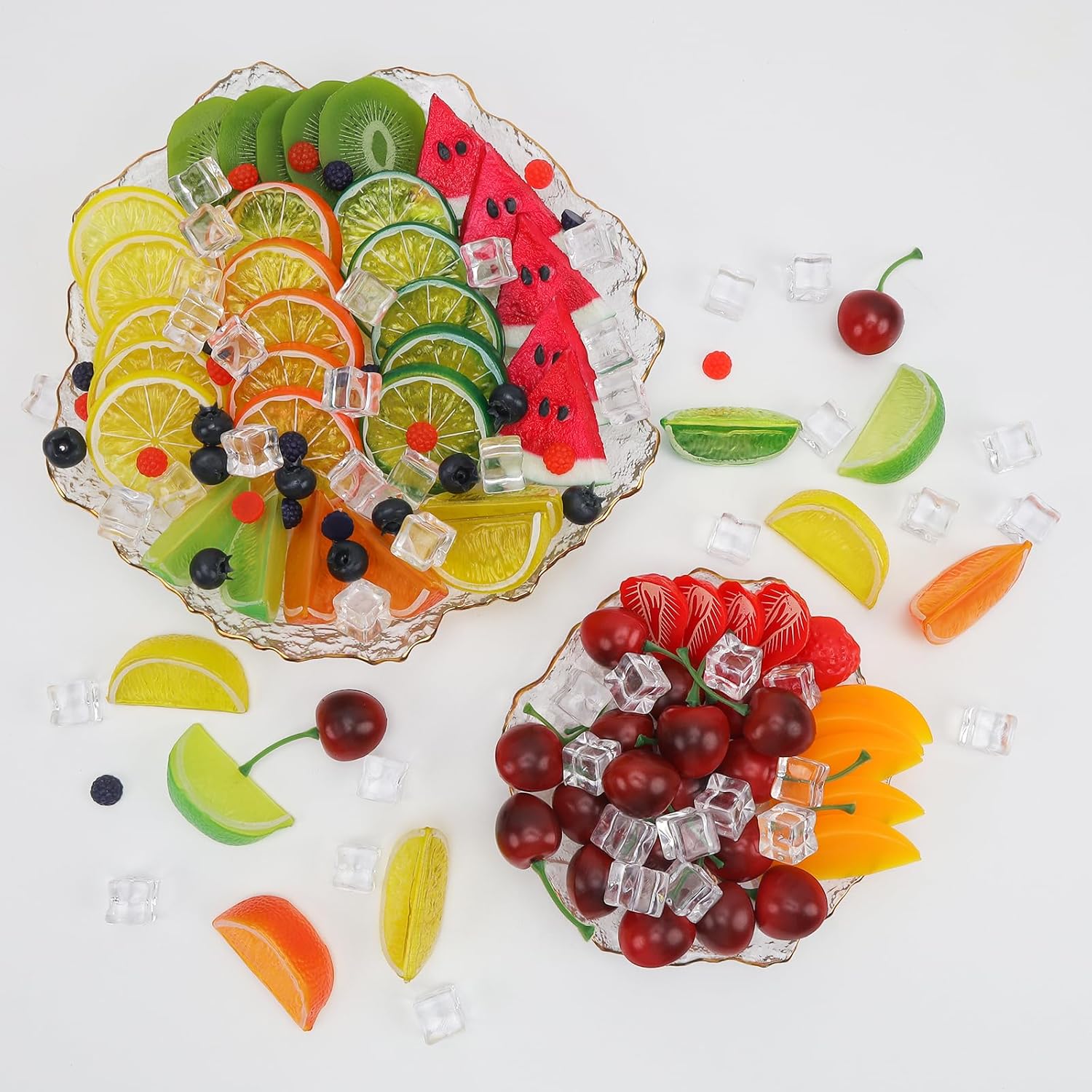 Realistic Combination: You will receive 160 artificial fruit slices, including 15 fake lemon slices (5 yellow, 5 green, 5 orange), 15 lifelike lemon blocks (5 yellow, 5 green, 5 orange), 5 kiwi slices, 5 watermelon blocks, 5 yellow peach blocks, 5 strawberries, 20 raspberries (10 blue, 10 orange), 10 blueberries, 30 cherries and 50 ice cubes.Lifelike Design: Artificial simulation fruit slice and blocks models are lifelike, vivid texture of the fruit, the bright colors and shapes make it look fresh, realistic surface makes each fruit ornament look extremely detailed, printed with patterns on both sides, just like real fruits, suitable for use as decorative props in various occasions.Quality Assurance: The artificial and realistic fruit slices are of good quality, these lifelike simulation fruit models are made of plastic, PVC plastic will not rot, environmentally friendly and safe to use, and can be reused, which can be matched with different decoration styles easily. Please stay away from children under seven years old and avoid accidental ingestion.Easy to Clean: All artificial ice and fruit slices ornaments are reusable, not easily worn or deformed, and can be used multiple times, for easy cleaning, please wipe with a damp cloth. Fake fruit slices showcasing fillers have a fruity texture and are super realistic, they look more shiny than real fruits, feel smooth, and do not have sharp thorns, very suitable for any food combination decoration.Versatile Occasions: Fake artificial fruit slices are perfect for various occasions. Widely applicable to DIY craft, photography prop, painting, sketch, film set, early education props, home, house, cabinet, table, kitchen, party, furniture, window display, vase filler, vacation, wedding, festival, holiday, Christmas, Thanksgiving, birthday, indoor, outdoor, theme decor, garden, farmhouse, storefront, pub, office desk, supermarket, restaurant, fruit bowl, centerpieces and other occasions.