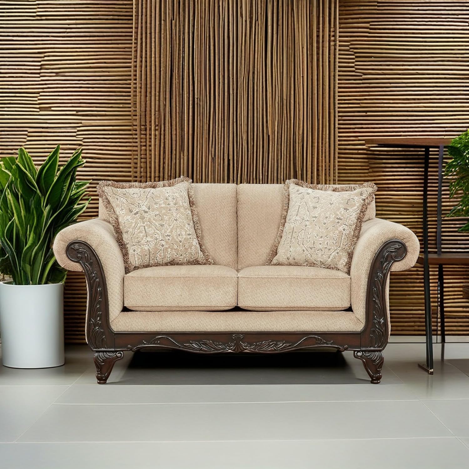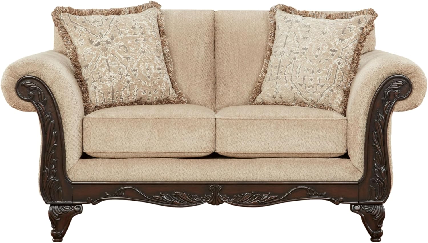 With its polyester blend upholstery and fabulous colors, this Hernen Carved Wood Frame Living Room Loveseat is sure to be a luxurious addition to your living room. The rolled arms show off carved panels on the front and an adventurous mix of super-soft chenille fabric and printed throw pillows, designed legs with a rich espresso finish add a touch of contemporary elegance. Those carved wooden details continue across the arch of the lower face and hardwood feet. High-density foam padding adds deep support and comfort that you can enjoy every day. It's available in two trendy colors: Slate Gray and Beige Wheat.