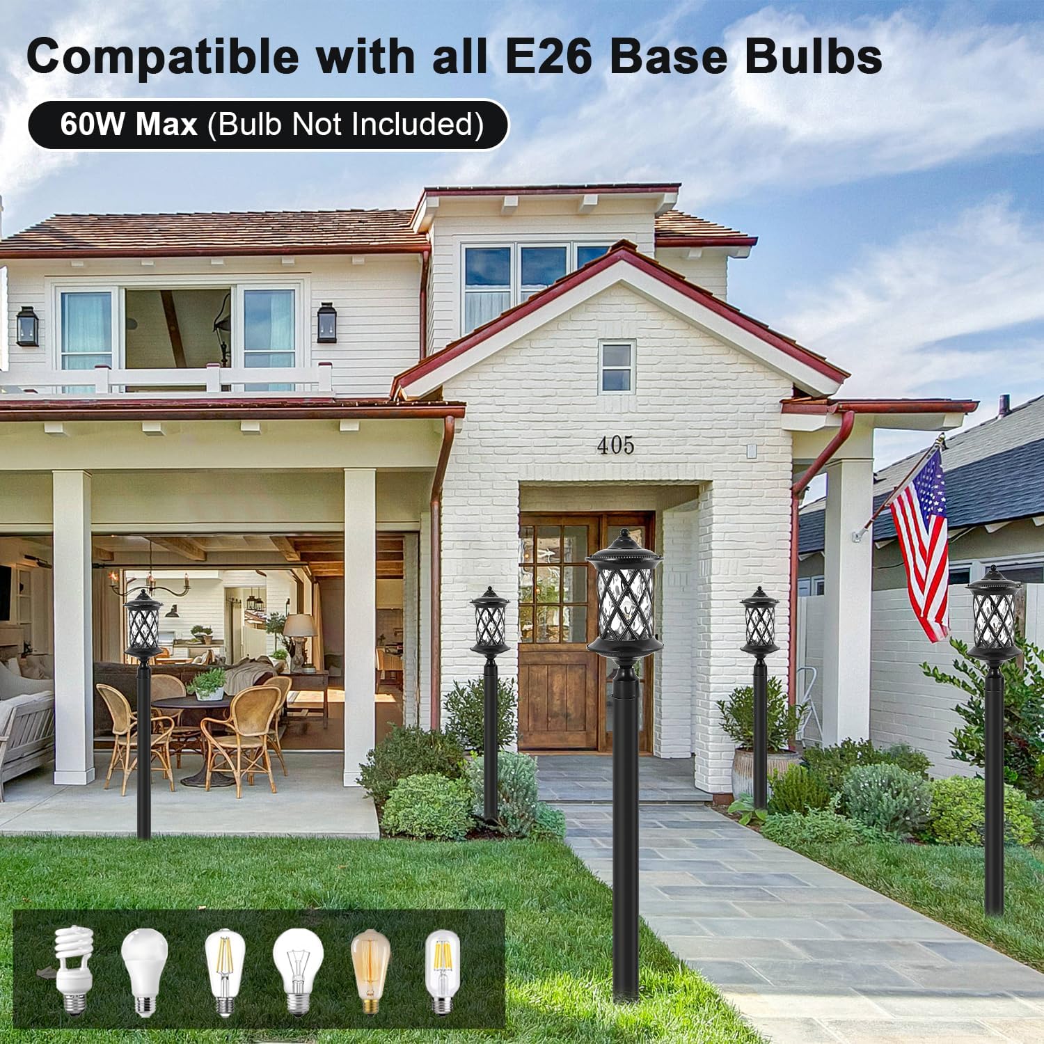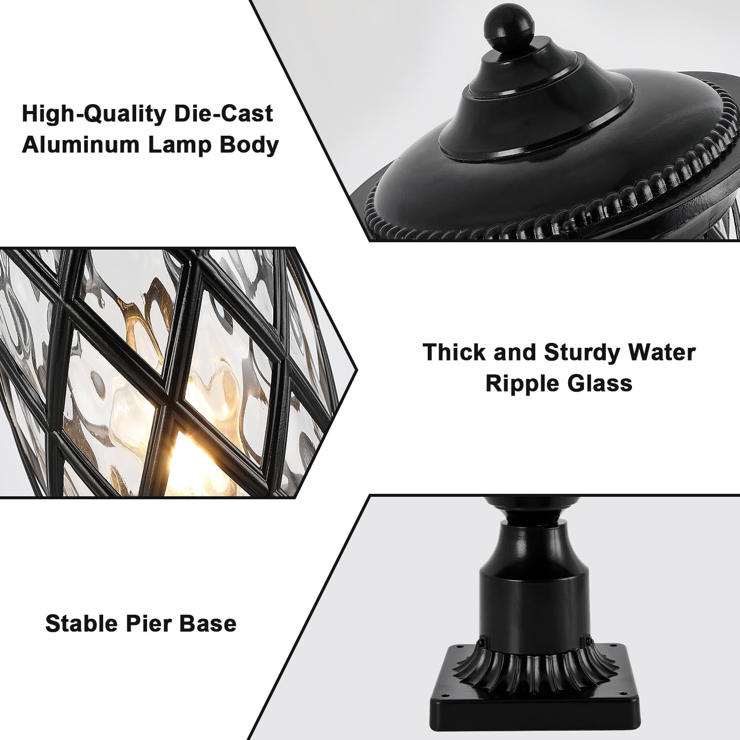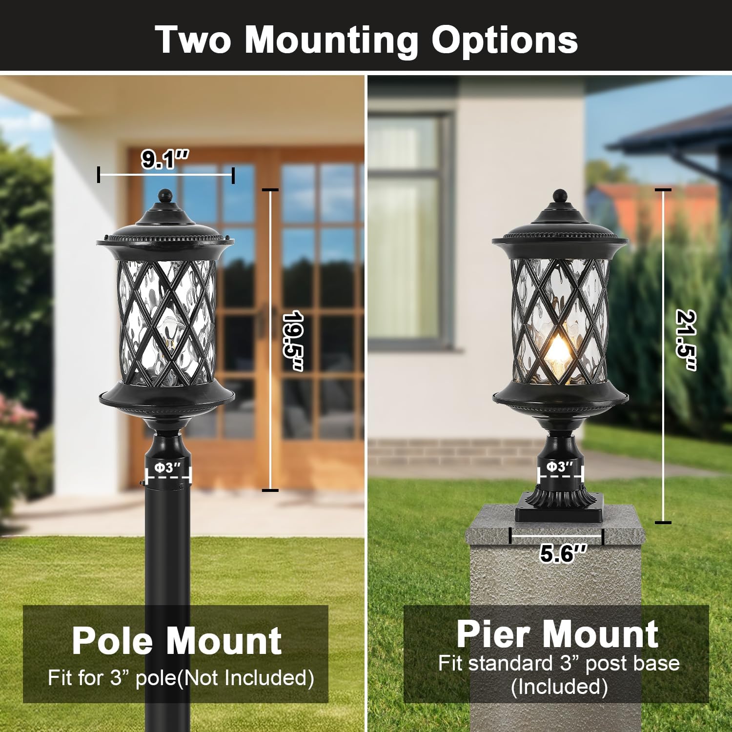 The outdoor post light fixture adopts the appearance design of the water glass lampshade, and the soft corrugated lamp adds a unique and comfortable light to your house. The sand black lamp arm and the classic retro design add a mysterious and gentle atmosphere to your outdoor decoration.This is a great choice for you to decorate any outdoor. Two-way use outdoor post top lighting fixture: Place this post top fixture on a 3" diameter post( Not included) or fix it with the mounting base (INCLUDED) IP65 Waterproof - Features study metal constructions, suits for wet locations,waterproof design make the exterior post mount light fixture durable in any bad weather. Suitable for rain and snow -Using high-quality die-casting aluminum material, anti-rust and anti-corrosion, suitable for any bad weather. Features Finish: Black Material:Aluminum, Glass Product Dimensions: 9.06"*9.06"*21.46" Bulbs: 1x60W E26 Bulb(not included) Voltage: 110V-120V. Maximum power of the light source: 60W. Note -Installation process is simple,When installing, Cleaning lamps and replacing light blubs, Must cut off power supply.If you have any installation problems can feel free to contact us. -The size is measured by hand, so there may have a 0.5in error, please kindly note that,our product pictures are taken in kind.