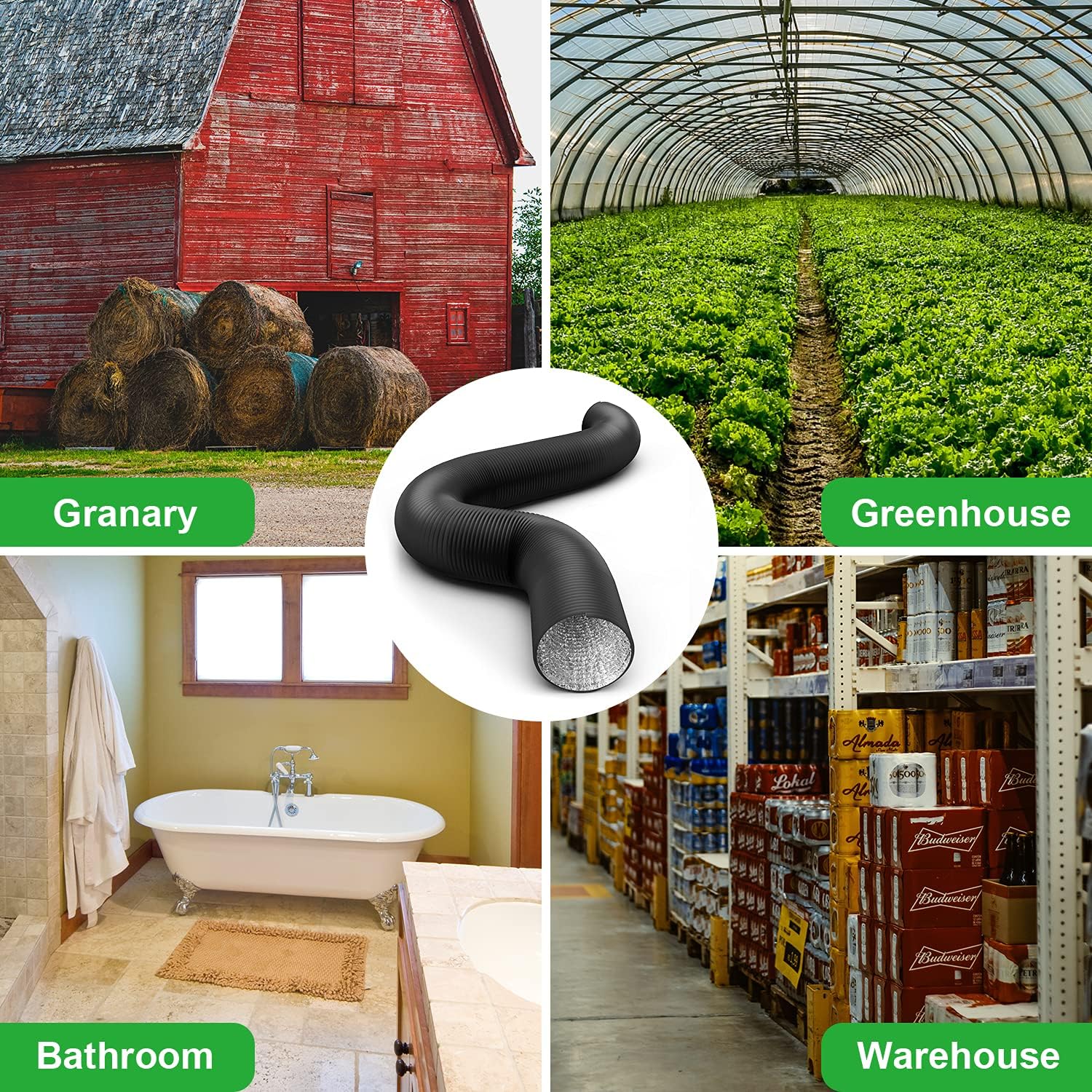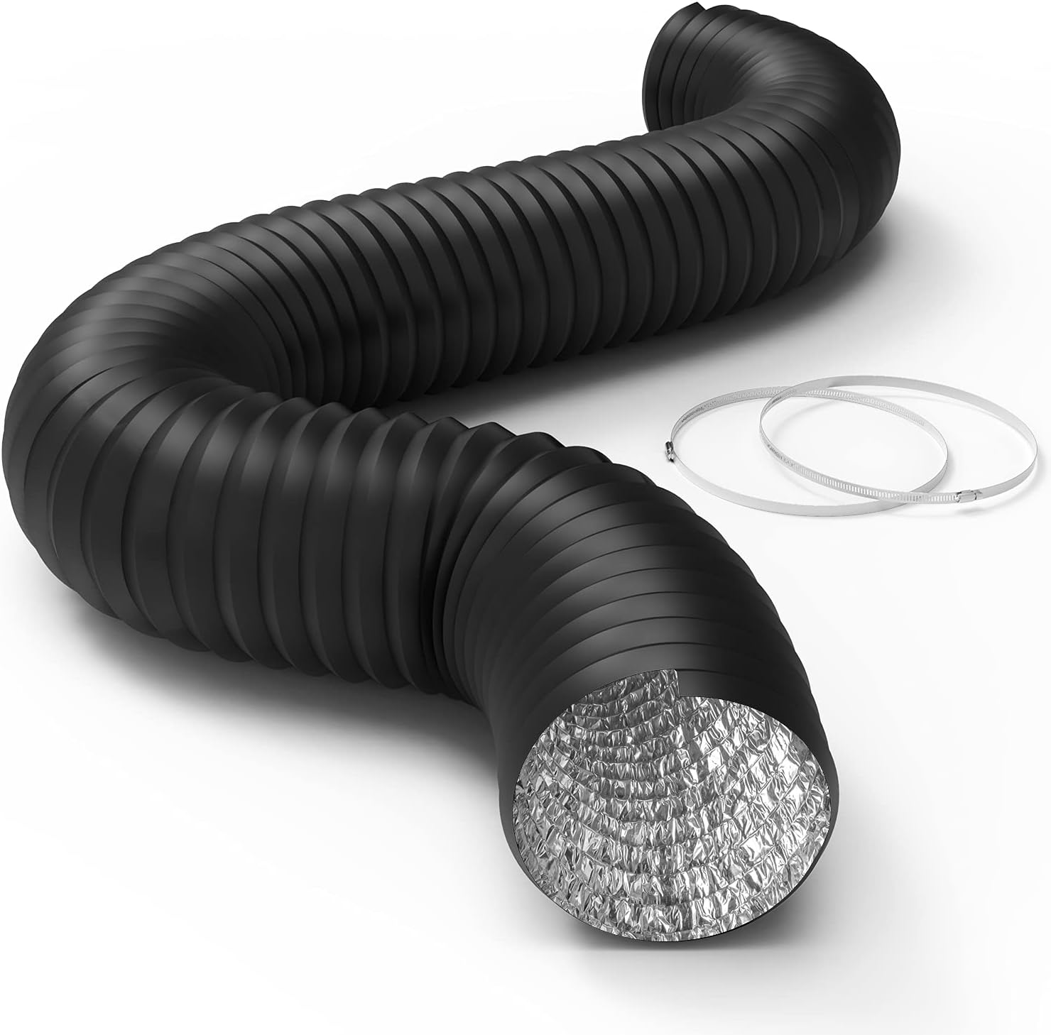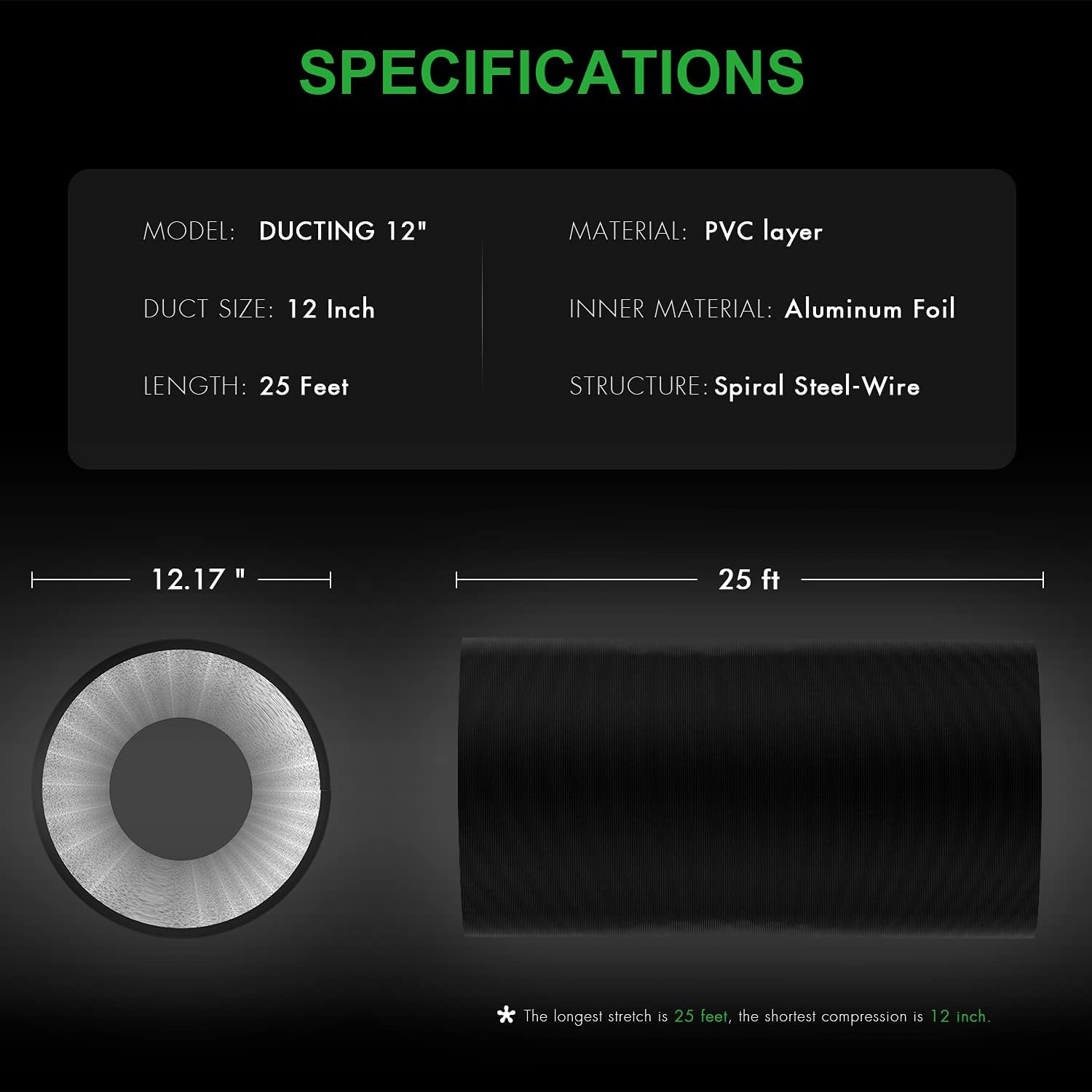 Specifications: ducting size: 12 inch; length: 25 feet; material: PVC thermoplastic; inner material: aluminum foil. Temperature range: -22°F~212°F(-30℃~100℃) Features: 1.Perfect for ventilation applications including HVAC, kitchens, dryer, bathrooms, greenhouses, grow rooms, grow tents, etc. 2.High-quality aluminum foil, high temperature resistant and corrosion resistant, long lasting. PVC thick layer on this ducting can prevent light leaks. 3.Four-layer design (PVC layer + Aluminum Foil + PET + Aluminum Foil) makes it more durable and resistant to leaks, tears, and cuts. 4.The aluminum foil duct tube can bend in any direction, allows you to accommodate most space restrictions. Flexible length for inline fan, quick and easy to set up. 5.Include a pair of 12 inch stainless steel duct clamps, rustproof and corrosion resistant. Variety of applications: Suitable for any ventilation & air conditioning (HVAC) purposes, move and deliver air in kitchens (cooking exhaust), green houses and grow rooms (air circulation, intake, exhaust and light fixture cooling), bathrooms (smell and moisture exhaust), grow tents and other applications.