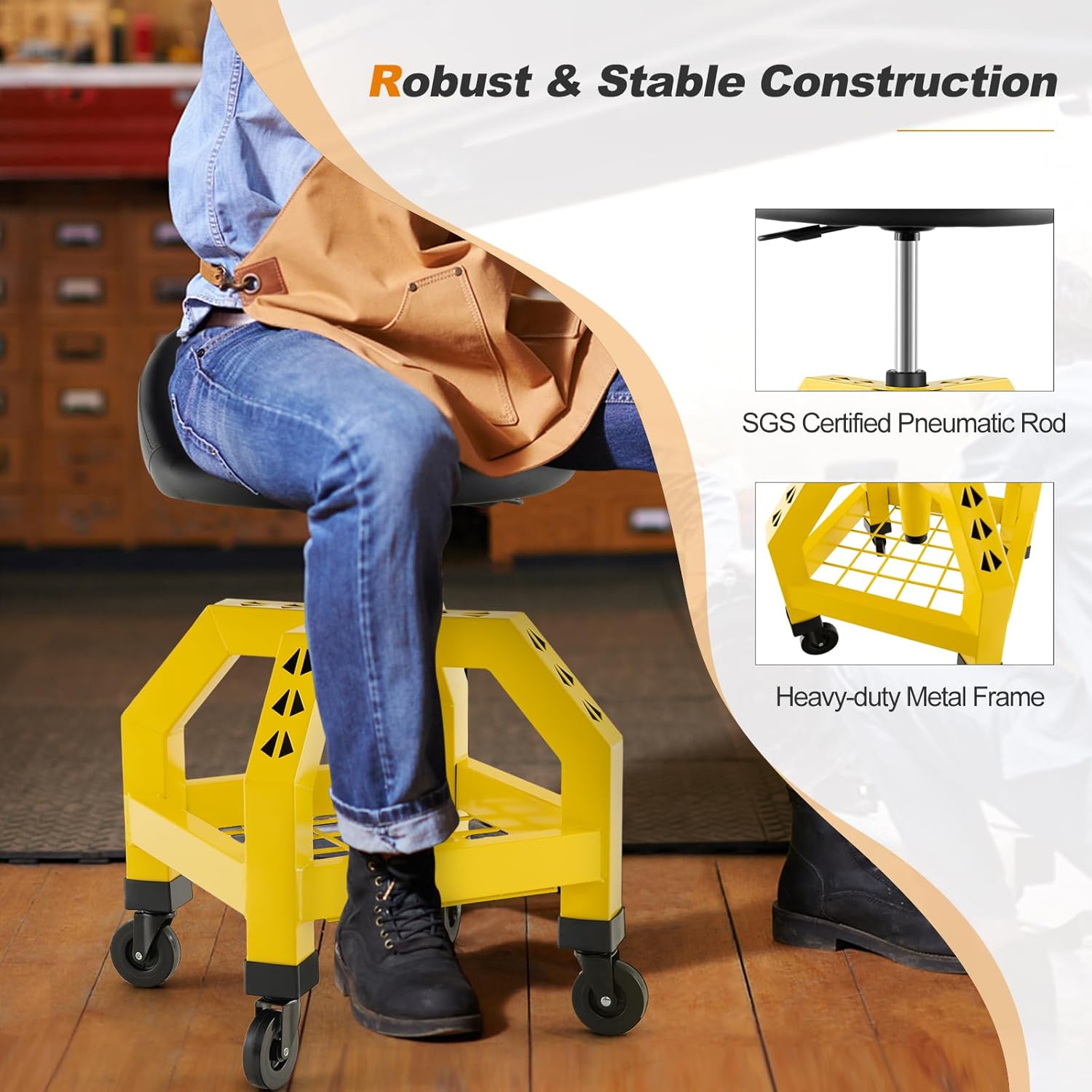 Our heavy-duty adjustable rolling shop stool is a versatile and reliable addition to your workspace. This stool is designed to provide maximum comfort and convenience while you work on various projects in your garage or shop.With its sturdy construction and adjustable height feature, you can easily customize the stool to suit your preferences and ensure proper posture while working. The durable wheels allow for smooth and easy mobility, making it effortless to move around your workspace.Features:✔ Heavy-duty steel construction ensures durability and long-lasting performance for heavy-duty tasks✔ PVC leather material provides comfort and a stylish appearance✔ Compact size with adjustable height range allows versatility in use, catering to different tasks✔ Built-in storage shelf provides convenient storage solution for tools and equipment✔ 360° swivel wheels enable easy movement and access to different areas without the need to reposition the stool✔ Supports up to 330lbs weight capacity offers stability and safety, providing peace of mind during use✔ Practical rolling garage stool, perfect for DIY enthusiasts, mechanics, pottery artist and resto shop workerSpecifications:Color: Black, YellowMaterial: Steel, PVC, PPNet Weight: 24lbs/11kgsLoad Capacity: 330lbs/150kgsOverall Dimensions: 17.5'' x 16.5'' x 31.5''/44cm x 42cm x 80cm(L x W x H)Size of Seat: 13'' x 14'' x 22.5''-27.5''/33cm x 35cm x 57.5cm-70.5cm(W x D x H)Diameter of Caster: 3''/74mmPackage Includes:1 x Rolling Shop Seat1 x User Manual