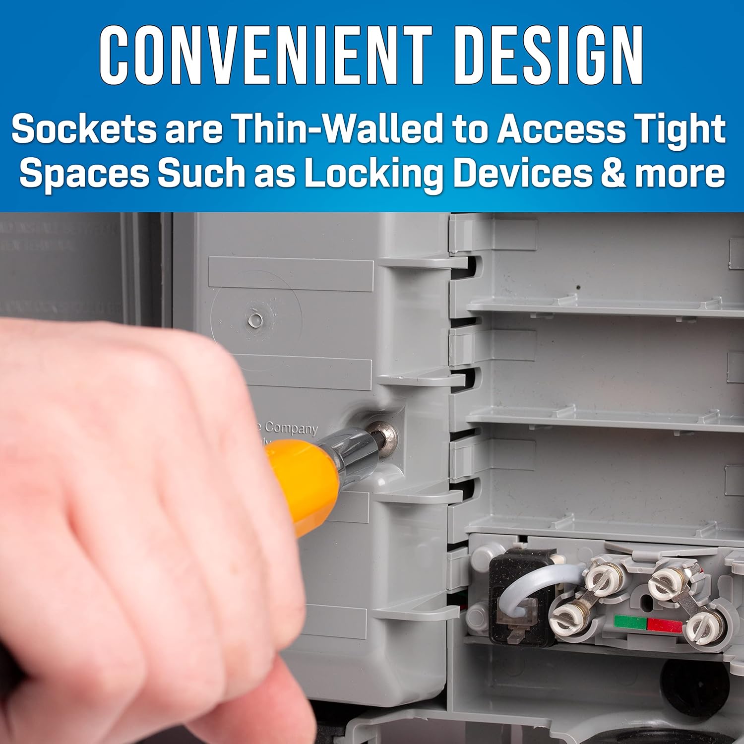 The Jonard Tools M-216CKIT Can Wrench Security Key Kit is designed to fit over long binding posts and is the perfect tool kit for opening telephone box fasteners and tightening nuts on binding-post terminals. The can wrench features the following: 1) Built-in wire stripper with two slots: one for stripping the outside jacket of four wire "quad" cables and the other for 22 AWG wire, 2) Security key insert (SK-51632) has a double-ended hex adapter for 5/16” and 5/32” pin-in-head security fasteners, 3) Hex shape on outside of sockets can be used with a wrench to maximize torque, 4) 7/8” diameter impact-resistant thermoplastic handle is ergonomically designed and color-coded orange, 5) Thin-walled sockets access tight spaces such as locking devices on terminals and cabinets, 6) Total length is 7” with 1 1/4” (32 mm) deep sockets to fit over long binding posts, 7) Heat treated alloy steel sockets provide long life and durability. The kit includes the M-216CS22 Ergonomic Can Wrench with Wire Stripper and the SK-51632 Security Key Insert.