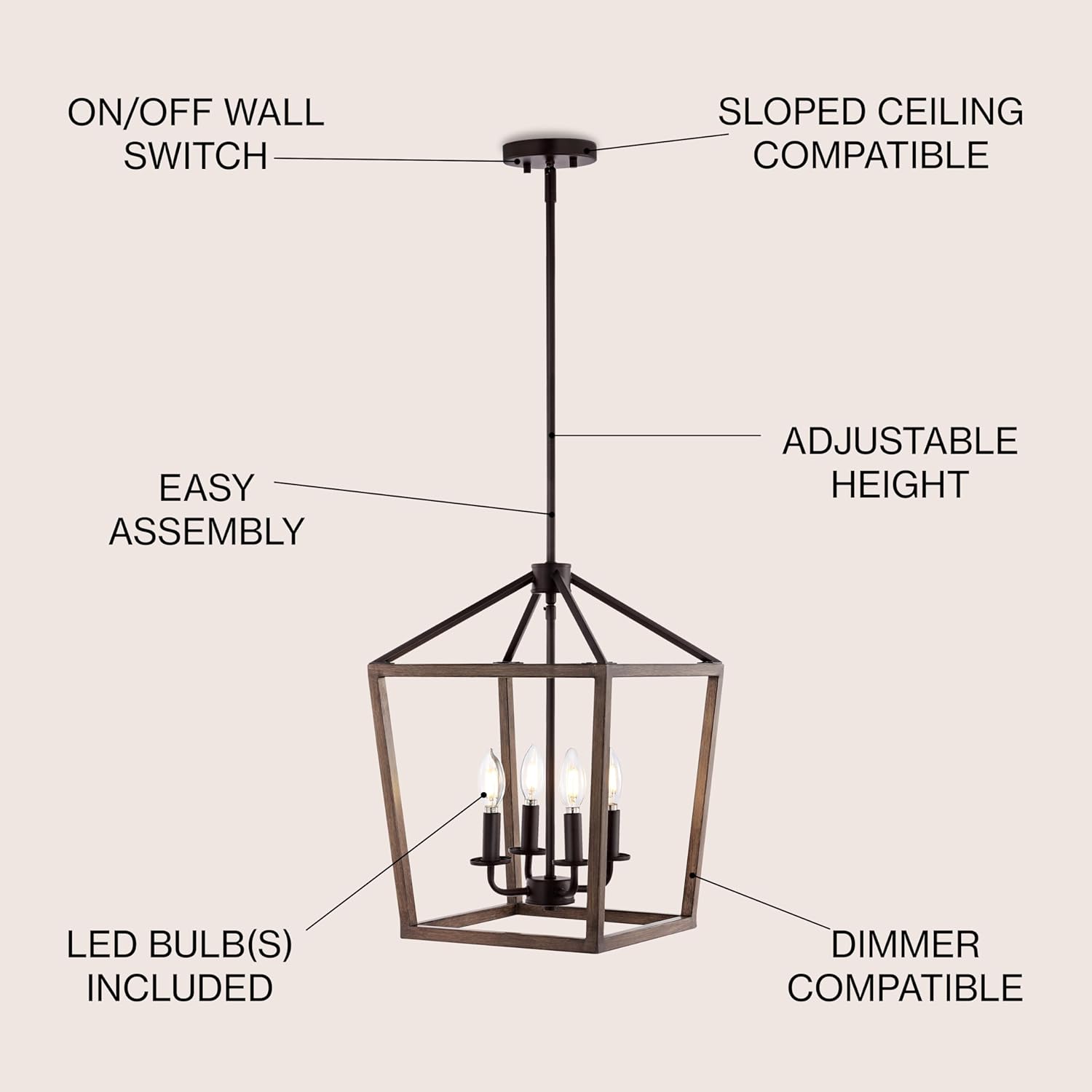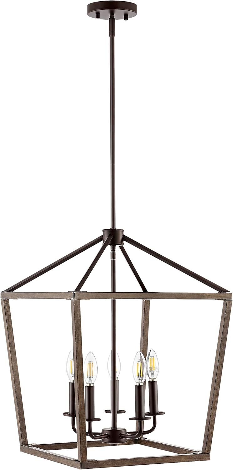 This classic lantern pendant light features a metal caged frame of negative space with exposed bulbs that illuminate from within the center. The shape of the fixture is inspired by iconic street oil lanterns. The pendant light suspends from a chain link that is adjustable to allow the fixture to hang only 34"down, or up to 106" from your ceiling, where it anchors with a round metal canopy.