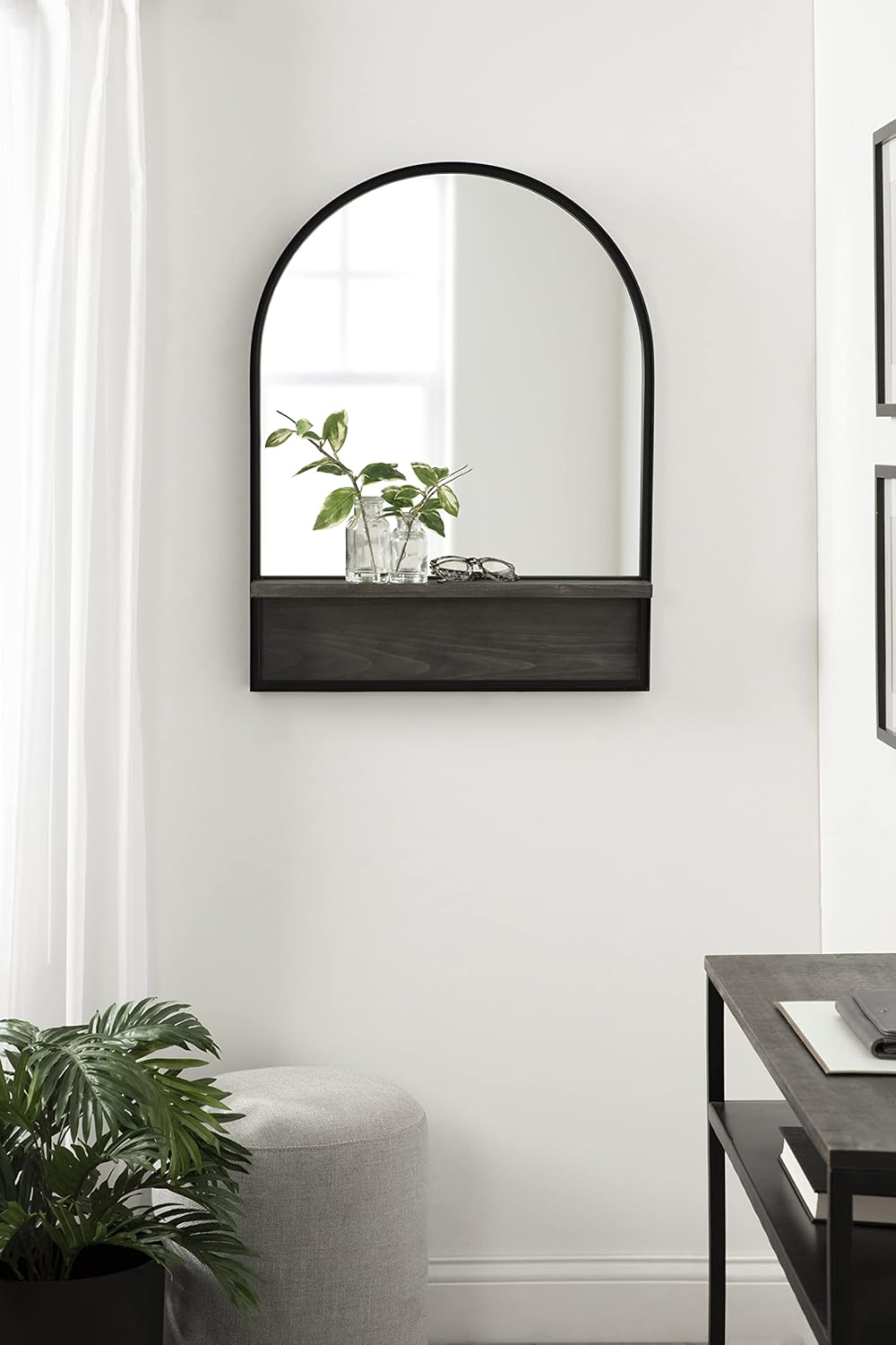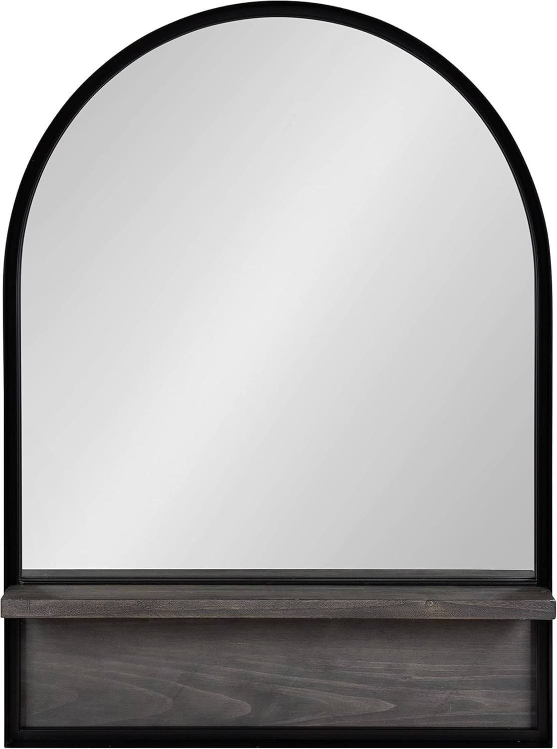 Enhance your cozy farmhouse home with the Owing mirror, a piece of wall decor that blends fashion and function within its robust design. This beautiful mirror features a two-tone charcoal and black finish, creating a stylish look that fits into various color schemes throughout the home. The Owing is an arched mirror that features a small display and storage ledge crafted from wood. The black frame is constructed from resilient iron, allowing it to last multiple years of high-quality display. This accent piece is fantastic for showcasing your unique style while highlighting your room's natural light with its large reflective surface area. The overall display dimensions of the Owing are 24 inches wide by 4 inches deep by 32 inches tall, creating a commanding presence that draws attention and captivates onlookers. Use this timeless wall hanging mirror as a decorative focal point for your wall decor display or enhance your vanity as a bathroom mirror with storage. Use the metal D-ring hangers attached to the back to hang this mirror in your living room, bedroom, bathroom, or entryway.