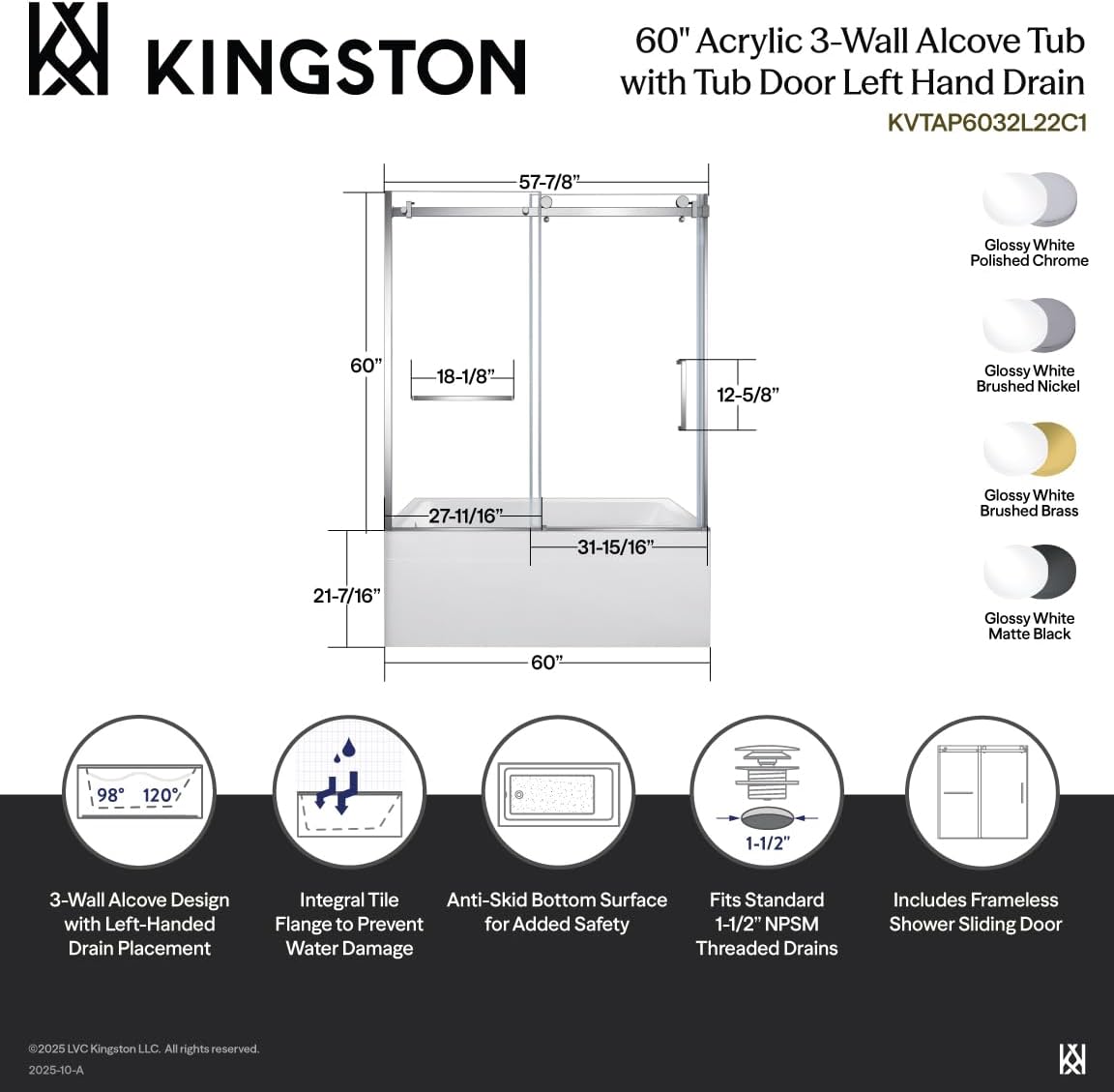 Upgrade your bathroom with the Kingston Brass 60" Acrylic Rectangular 3-Wall Anti-Skid Alcove Tub with Sliding Tub Door. Designed for safety and elegance, this tub features an anti-skid surface for secure footing and a frameless sliding door for effortless access. The durable acrylic construction ensures lasting performance, while the 3-wall alcove design maximizes space efficiency. Perfectly blending modern aesthetics with practicality, this tub is the ultimate choice for a stylish and functional bathroom upgrade.