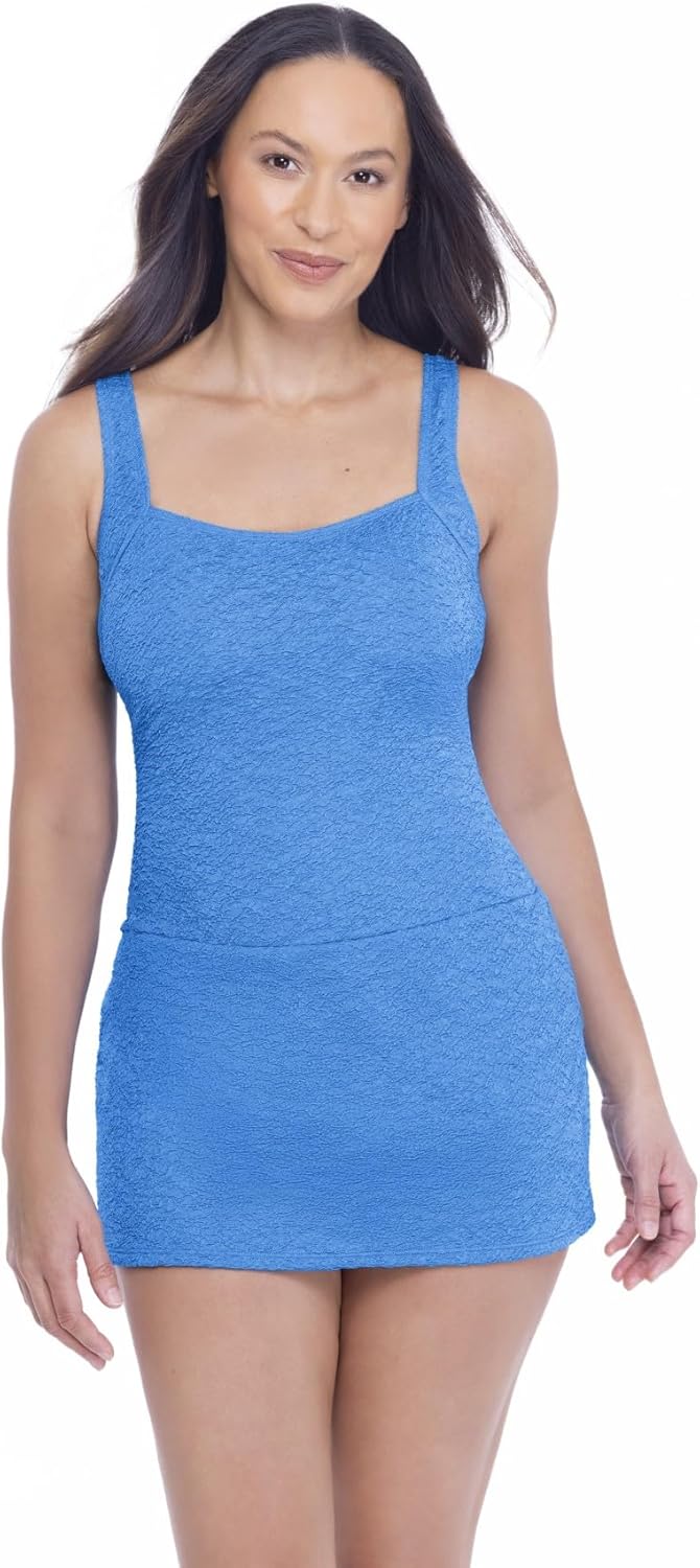 Grace Meets Movement: The textured straight back, square neck one piece. For swim sessions that build strength and confidence, you need a swimsuit that moves with you. Krinkle’s signature textured fabric isn’t just stylish, it’s built to endure and trusted by women for decades. Made from 100% chlorine-resistant polyester, each suit is designed to stand up to regular pool workouts, spa sessions, water therapy, salt and fresh water and beyond, without fading or breaking down like conventional swimwear. Fully lined with a tummy control panel and thoughtfully constructed with a soft cup bra for comfort, every Krinkle swimsuit helps you feel supported, sculpted, and ready for movement - no matter your pace. This Krinkle skater swimdress is thoughtfully designed to provide comfortable coverage with a flattering, easy-moving fit. The softly flared skater skirt offers gentle drape and freedom of motion while maintaining modest coverage through the hips and thighs. The classic square neckline and straight back lend a personalized fit and unrestricted movement. This creates a silhouette that feels balanced and boosts confidence through every water exercise class or active pool and beach days.