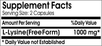 Lysine is an indispensable amino acid that cannot be made by the body. Amino acids form the basis for protein, which helps construct and maintain the critical structures in the body. Lysine is also used for the health and integrity of skin. DIRECTIONS: For adults, take two (2) capsule daily, preferably with a meal.
