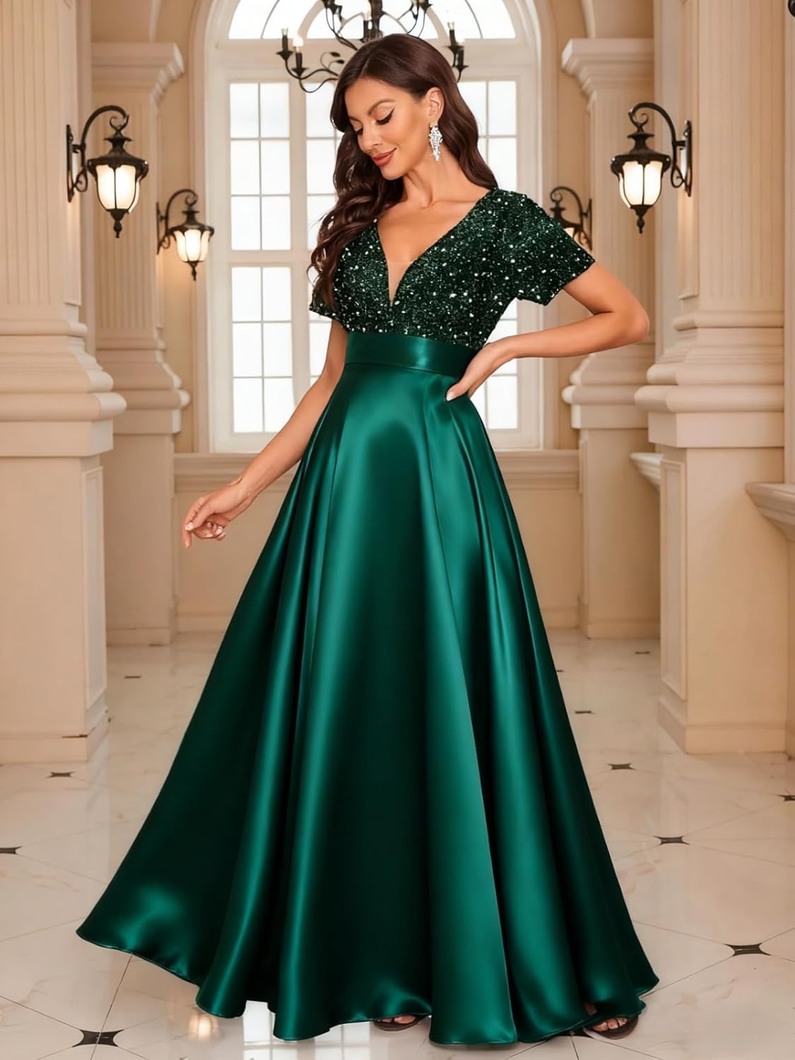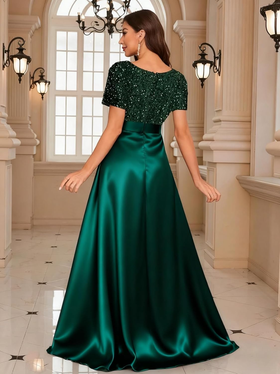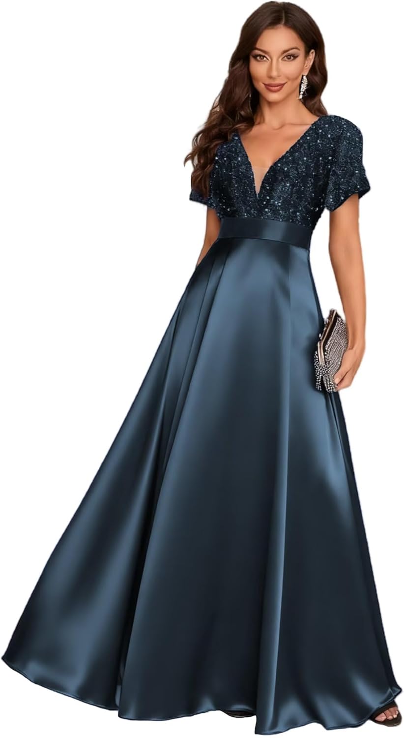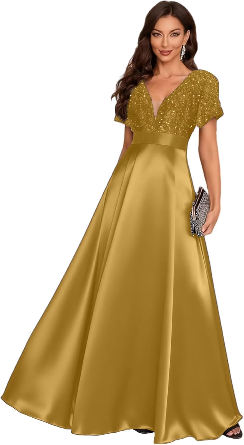 Welcome to our Store!Fabric: Satin SequinFeatures: Dolinecy Sequin Mother of The Bride Dresses for Women V Neck Short Sleeve Satin Long Formal Evening Gown with PocketNeckline: V NeckSleeve Type: Short SleeveSilhouette: A LineLength: Floor LengthBack Design: ZipperBuilt in Bra: NoHow to choose size:Measure your body and compare it with our size chart. If you want a more accurate fit, please send us your measurements as follows:1. Bust___inches or___cm2.Waist___inches or___cm3.Hips___inches or___cm4.Hollow to floor ___inches or___cm5.Height(without shoes)___inches or___cm6.The date you need the dress:____How to contact us:We provide customers with 24 - hour online consultation service. If you need any help, please let us know at any time.1.The real color of the item may be slightly different from the pictures shown on website caused by many factors such as brightness of your monitor and light brightness.2.Please allow slight deviation for the measurement data, You are very welcome to Our Shop costume for any question, we will always be here with you.