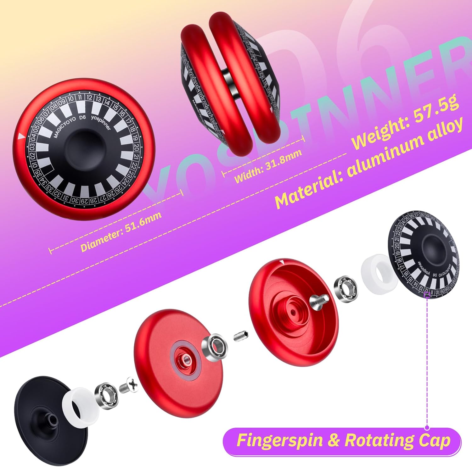 Why choose D6 YOSPINNER? Tired of single-function toys that get bored quickly? The D6 YOSPINNER redefines fun with its all-in-one design that combines the precision of a professional 2A Yoyo with the joy of a spinner, the excitement of a top, and even interactive divination games! It is made of high quality metal and is permanently built to ensure smooth turns, easy control and endless entertainment for kids, teens and adults. Whether you're a beginner wanting to master Yoyo tricks or an experienced player wanting new challenges, the D6 turns every moment into a fun adventure. PERFECT FOR ANY OCCASION Skill Building: Teaches hand-eye coordination, patience and concentration, great for children's development. Stress Relief - A relaxing fidget toy for busy adults or anxious teenagers. Social Fun: Interactive games (divination, race) bring friends and family together. Entertainment on the go - Compact enough to fit in your pocket, backpacks or purses, have fun anywhere and anytime. YOSPINNER Different game modes: Game Mode 1: Yo-yo Function Can be used as 2A-Yo-Yo. Game Mode 2: Finger Spinner Function A unique structural design allows you to rotate the ball body and spinner caps independently. Enjoy the fun of a finger, while also using it as a hand toy to relieve stress. Game Mode 3: Spinning Top Function Players can pull the ball with the rope, rotate it at high speed and then place it on a table or floor to function as a spinning top. Game Mode 4: Gyro Function Quickly pull the ball with the rope to start a high rotation speed, then insert the tip of a pen (or other sharp object) into the groove on the spinner cap, the product will constantly spin on top. Game Mode 5: Gambling The numbers are engraved on the spinning cap. Players can gently move the cap for divination games, such as guessing high/low or odd/equal. Perfect for fun friends and extra fun to meet. Game Mode 6: Racing Game Quickly pull the ball with the rope to rotate it at high speed, then place it on the floor like a wheel - once released, the product will roll forward quickly. (Feel free to use your creativity to unlock more ways to play with this product!)
