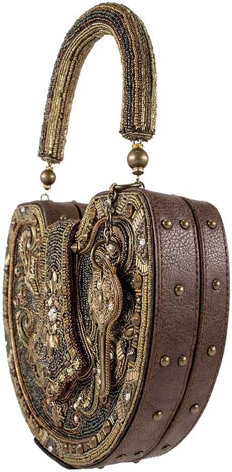 Unlock your inner style icon with this glitzy designer handbag. Hand crafted with thousands of metallic gold and bronze beads, this handbag features a full beaded top handle as part of the lock design and a dangling key charm for a touch of whimsy. Along with an inside pocket for easy access, this product has a magnetic flap closure incorporated into the design to keep your wallet, cell phone, keys, and more safer than ever. Respect for the artisan is just as important as respect for the customer. That’s why Mary Frances only works with socially compliant partners for the highest quality products you can love to wear and be proud to own.