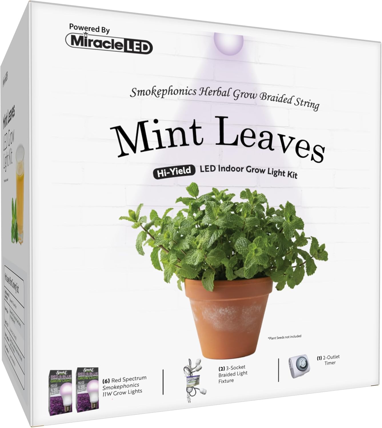 Looking for a grow light that will help your Mint grow and thrive? Use Miracle LED’s Smokephonics Mint Starter Grow Light Kit to help your plants live to their fullest potential! Mint Leaves are a kitchen stable but too little or too much light can stump their growth and development. Our Smokephonics grow light kit which uses the power of Purple spectrum to provide the nutrients your plants need to grow nice and full, helps you be in control of the distance and amount of light your plant receives. Mint plants need at least 4-6 hours of bright direct light per day to properly thrive! The Smokephonics Bulbs are designed to replicate the light spectrums found in Professional Grow Farm equipment right in your home! Plus, enjoy the braided, strong, and water resistant 3-socket that makes it easy to setup anywhere in your home, apartment, or dorm room elevating your home aesthetic. You’ll never have to sacrifice the layout of your home; just plug in and hook on where ever it is needed. The timer included in your kit is great for controlling the amount of light your plant is receiving, automatically turning off the lights once the cycle is over and starts the cycle again at the set time. Images shown are for packaging and display purposes only. They are representative of the species or genus of plants that may be grown with artificial LED light. Results vary by many factors and artificial lights do not fully replace light from the sun.