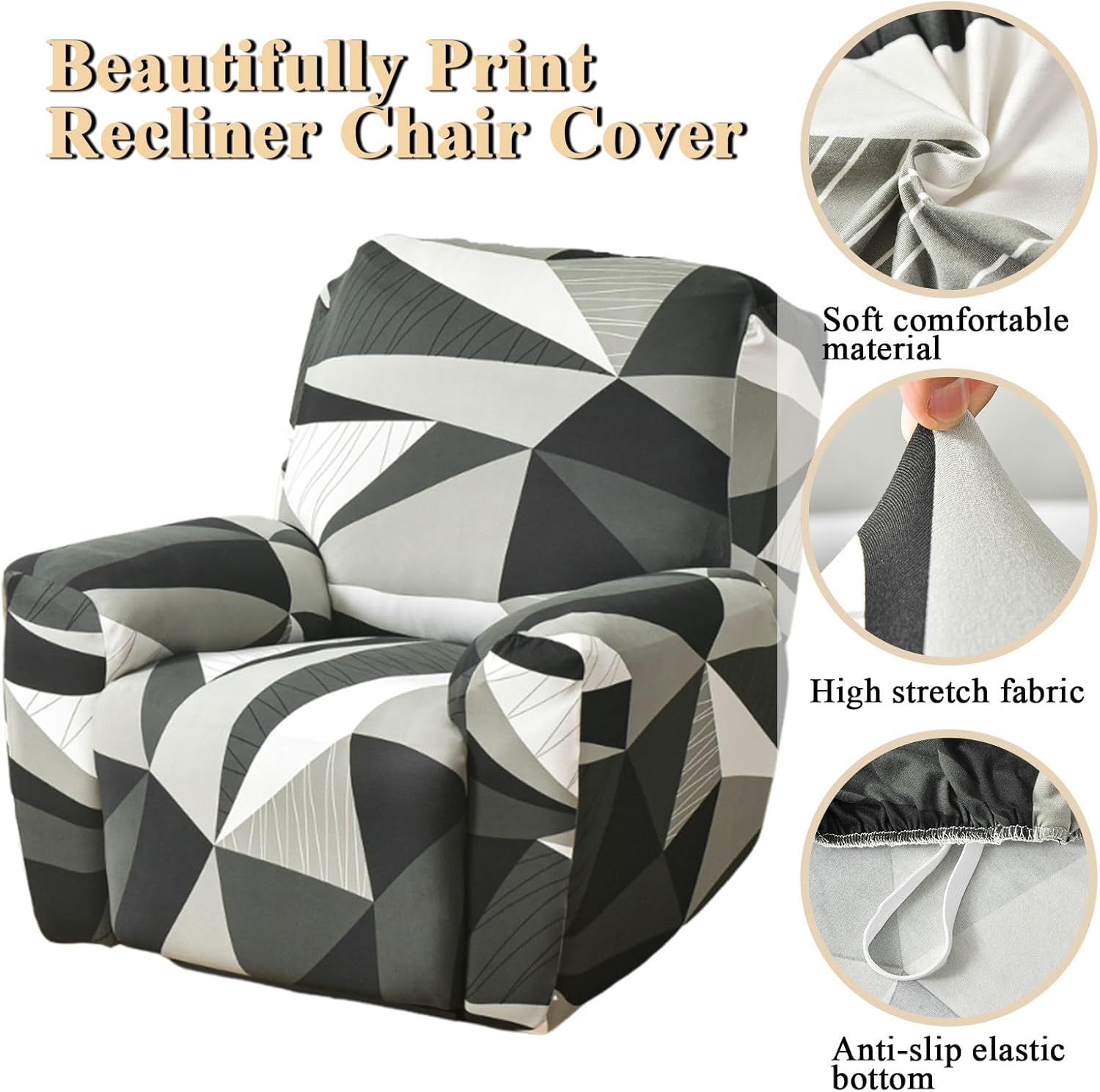 Durable fabric, thick and high stretchy, soft and breathable fabric to feel cool against your skin. slipcovers for recliner sofa dopted all-around coverage design which can protect your recliner from daily wear and accidental stains, like footprint, pet scratches, bites, and pawprint, free you from the worries of recliner chair wear or dirt. Separate design with the anti-slip elastic bottom, our cover for recliner chair can full stretch and cover the recliner chair tightly. 4 pieces recliner covers are high-stretch fabric, which allows it to fit snugly over your recliner. There are 1 piece back cover, 1 piece seat cover, 2 pieces arm covers. Easy to Install: 1. DRAPE THE FURNITURE / Position the slipcover with the labels. Evenly slip on the furniture. 2. PULL THE ARMS / the 2 sections arms cover the arms on the recliner. 3. PULL THE FOOTREST &SEAT / Stretch out the recliner so that thefootrest extends forward. 4. ATTACH / Attach elastic straps under the recliner.Tip the recliner on its side to gain access to the underpinnings. 5. TUCK & SMOOTH / Adjust the cover to make sure it fits the furniture. Then you can enjoy it. Hand wash or machine washable, wash at a temperature below 30 degrees Celsius. Do not bleach. Do not iron. Note: 1. Please measure before purchase. Please refer to the measurement guide in the photo for all measurements. 2. So please refer to the actual object, the photo is only for reference, and if you have any questions please contact us to help you solve. 3. The size may be slightly different due to manual measurement.