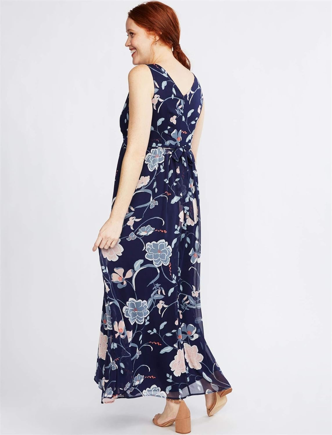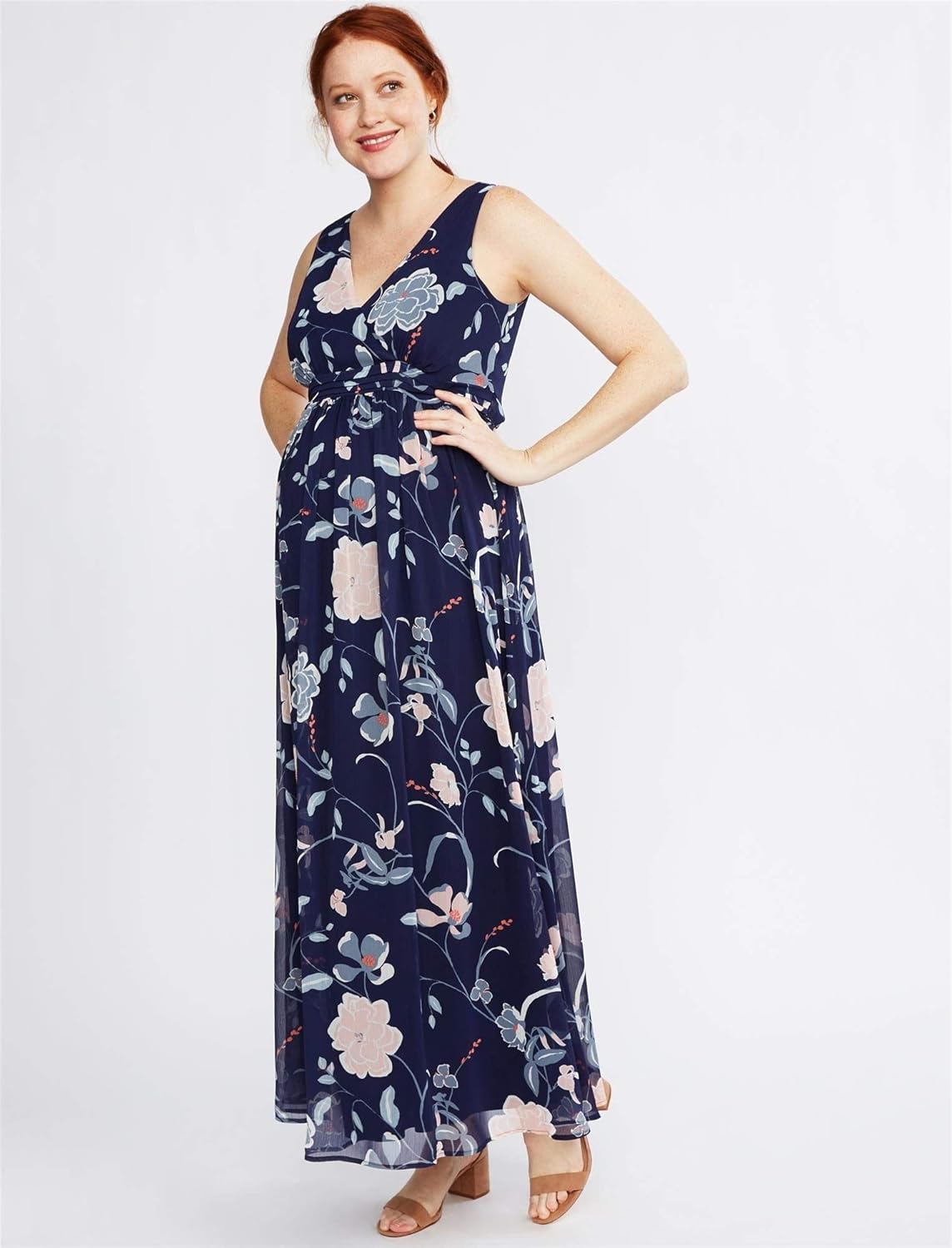 Sleeveless crinkle chiffon empire seam maxi dress with front bust shirring and pintucked waistband that is perfect to wear to any special occasion. A stylish dress to wear to a wedding or your baby shower