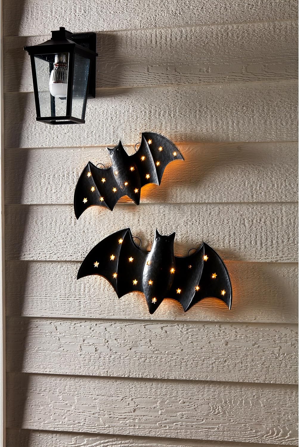 The Large LED Bat Decor is a stunning addition to any Halloween or gothic-themed decor. Crafted from high-quality tin, this hand-painted bat showcases intricate details that are sure to impress. The standout feature of this bat decor is the LED light-up cut-out star detail, which adds a mesmerizing glow to the overall design. To activate the LED lights, simply insert 2 AAA batteries (not included) into the designated compartment. This ensures that the bat decor can be conveniently placed anywhere without the need for a nearby power source. The LED lights emit a soft and enchanting glow, creating a captivating ambiance in any room. Measuring [insert dimensions], this bat decor is large enough to make a statement yet compact enough to fit in various spaces. Whether you choose to hang it on a wall, place it on a shelf, or incorporate it into a centerpiece, this bat decor is versatile and adaptable to your desired display. The hand-painted finish adds a touch of authenticity and uniqueness to each piece, making it a one-of-a-kind addition to your collection. The attention to detail is evident in the intricate brushstrokes and carefully chosen color palette, ensuring that this bat decor stands out from the rest. Perfect for Halloween parties, haunted houses, or simply as a year-round decoration for those who appreciate the darker aesthetic, the Large LED Bat Decor is a must-have item. Its combination of craftsmanship, LED lighting, and unique design make it a standout piece that will surely impress anyone who lays eyes on it.