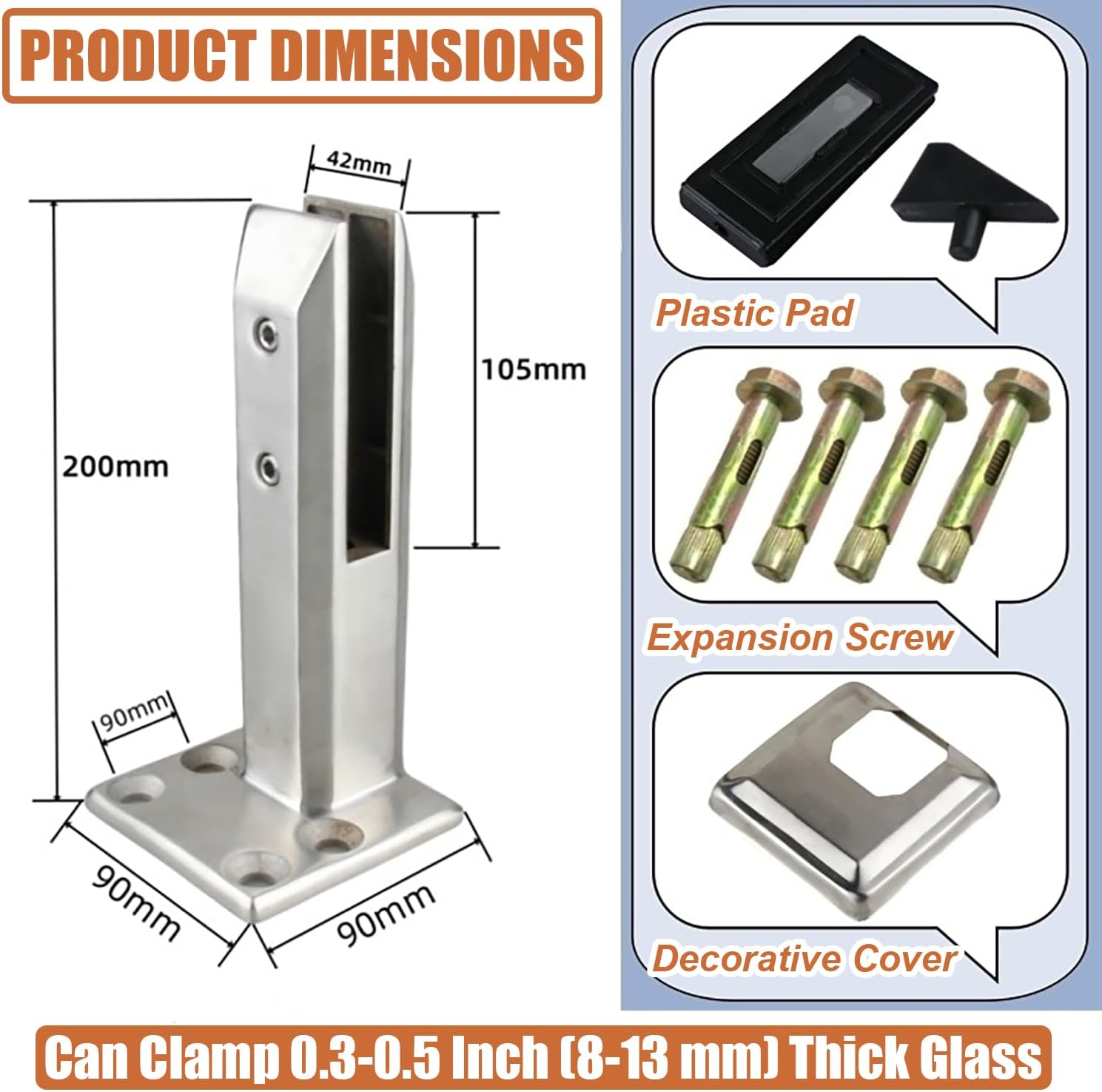 Upgrade Your Space with Professional-Grade Glass Railing ClampsOur 304 Stainless Steel Glass Railing Clamps are engineered for unmatched strength and elegance. Designed for frameless glass panels (8-13mm thickness), they effortlessly secure glass railings around pools, decks, balconies, and staircases.Why Choose Our Clamps?Marine-Grade Durability: Resistant to saltwater, UV rays, and rust, perfect for coastal homes and high-moisture environments.Adjustable Fit: Micro-tuning screws and rubber gaskets adapt to glass thickness variations (8-12mm), ensuring a snug, wobble-free hold.Safety First: One-piece cast construction eliminates weak joints. Supports glass panels up to 1.5m x 1.2m, meeting commercial safety standards.Aesthetic Versatility: Brushed silver finish blends seamlessly with modern or traditional designs. Minimalist profile keeps the focus on your glass.Ideal For:Frameless pool fencesGlass stair railingsBalcony safety barriersGarden deck partitionsCommercial and residential projectsPackage Includes:Clamp Cover (marine grade), Concrete Floor Screws, Tightening Screws, Rubber Washer, Metal Pad, Hex Key Drivers.Warm Notes:1. Please confirm that you know the size of the product before purchasing.2. For the stability of the glass railing, please make sure the installation surface is as flat as possible when installing the glass clamp.