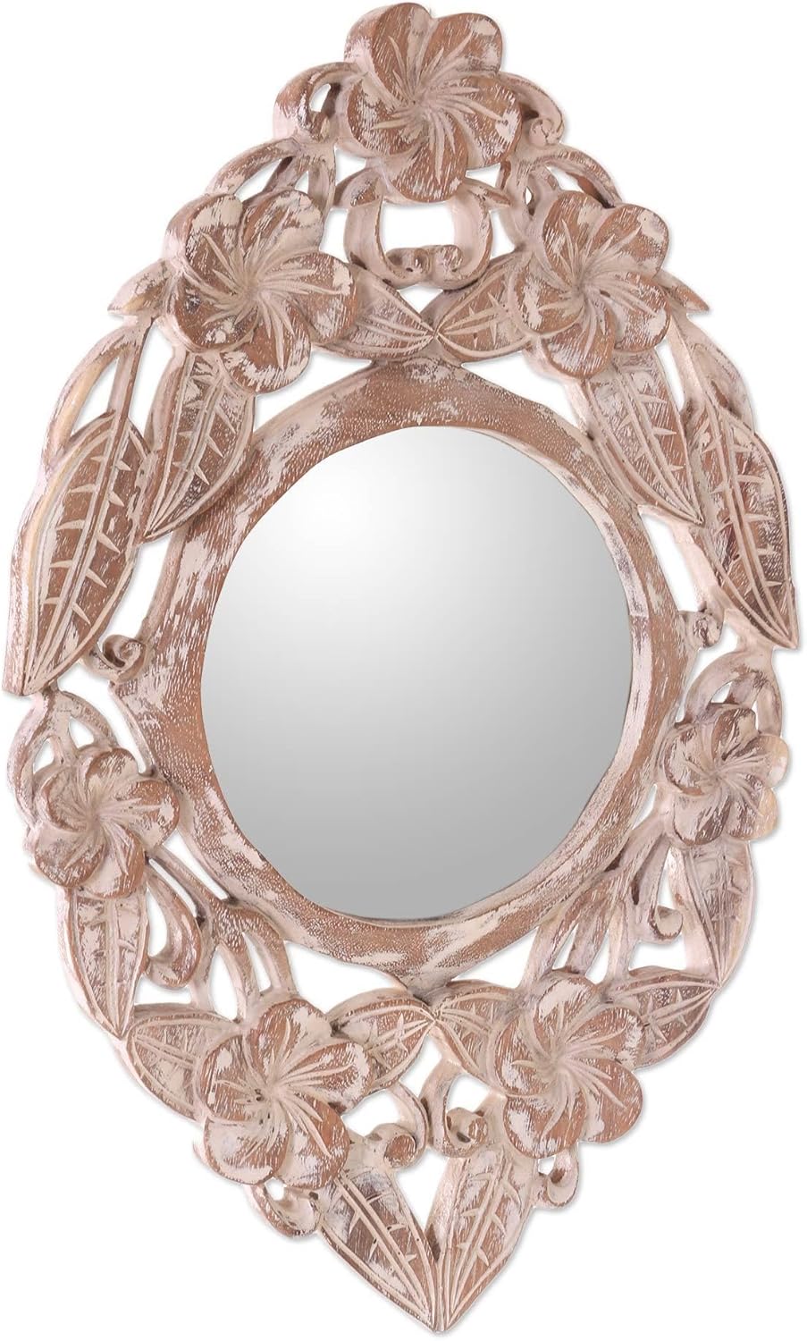 NOVICA, in association with National Geographic, works together with talented artisan designers around the world to produce stunning, keepsake treasures. Our mantra is to spread global happiness, so rest assured - we’ll do everything we possibly can to ensure you’re a happy customer. About this item: Frangipani flowers and leaves surround a round mirror. The detailed engravings that make up the frame are hand-carved from natural suar wood and given a white antiqued finish. Sarwaedi of Bali presents this beautifully crafted wall mirror as a charming addition to a hall or entryway. - Features an aged antique finish - Hand-crafted item -- color, size and/or motif may vary slightly - Wood grain and color can vary slightly About our Artist: Sarwaedi recalls, 'I was born in Sukawati, Gianyar in Bali on April 21 1970. In the town where I grew up, most people are wood carvers, and so was my family. I learned wood sculpture by watching my parents. In those days, children began learning the art at a young age and I was not alone. Today, I continue working with wood, but I'm focusing on making vases and classic boxes. I give unique finishes to my designs to distinguish them from the others.'